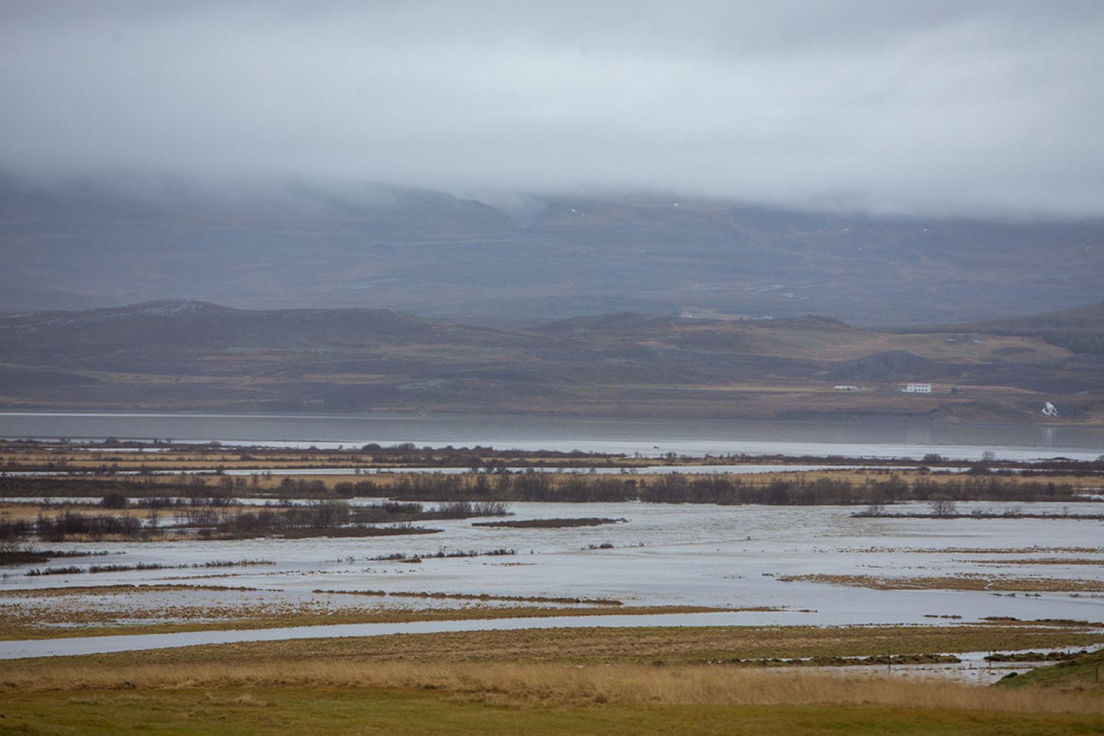 Vatnsyfirborð Lagarfljóts við Fellabæ hefur hækkað um tvo metra síðan á mánudagsmorgunn. Kristján Ólafur segir engar áhyggjur af brúnni milli Egilsstaða og Fellabæjar né heldur lögnum sem í henni eru.