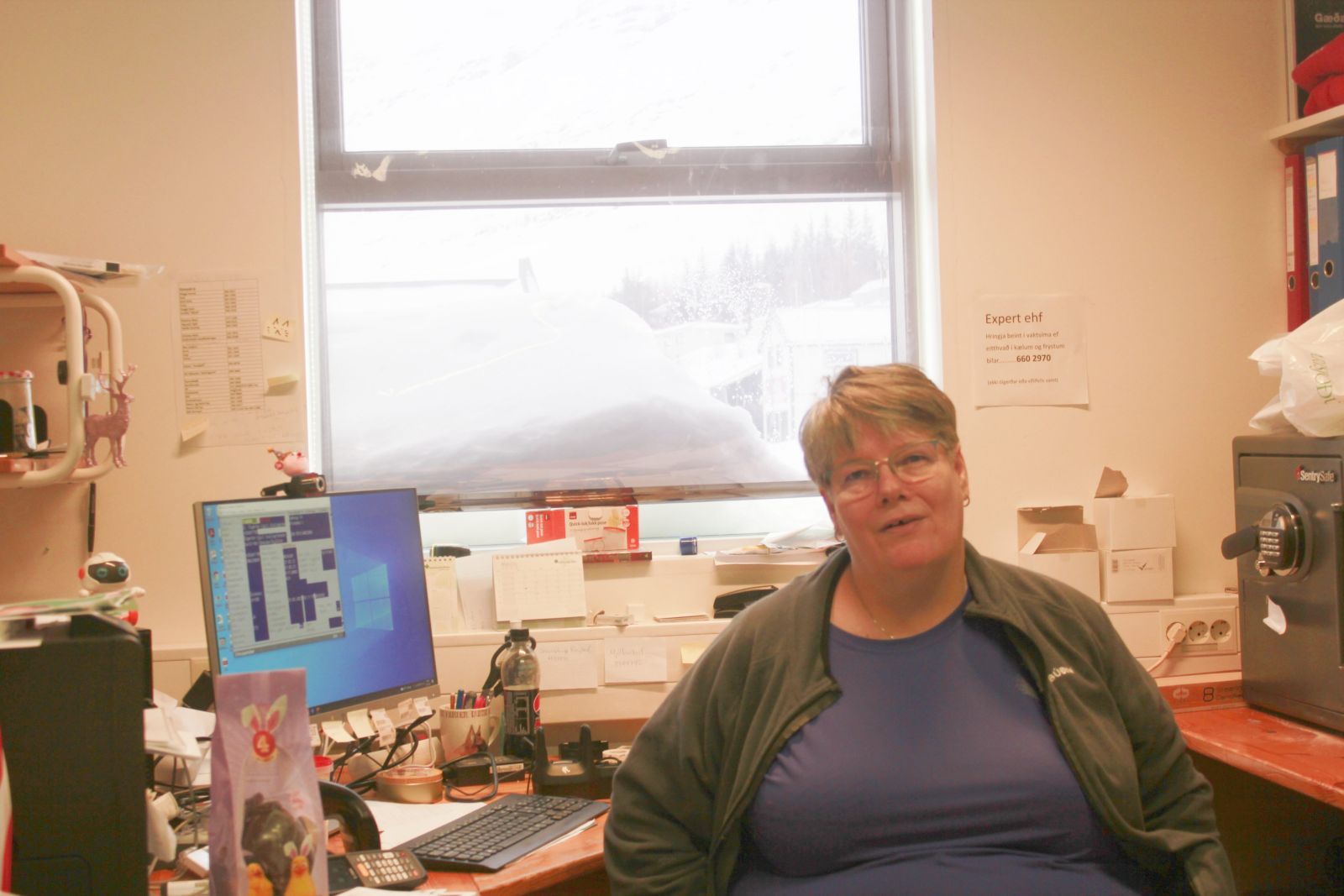 Klara verslunarstjóri á kontór sínum í Kjörbúðinni. Hún segir vissulega hræðslu í samfélaginu en allir séu að leggjast á eitt að gera vont betra. Mynd AE