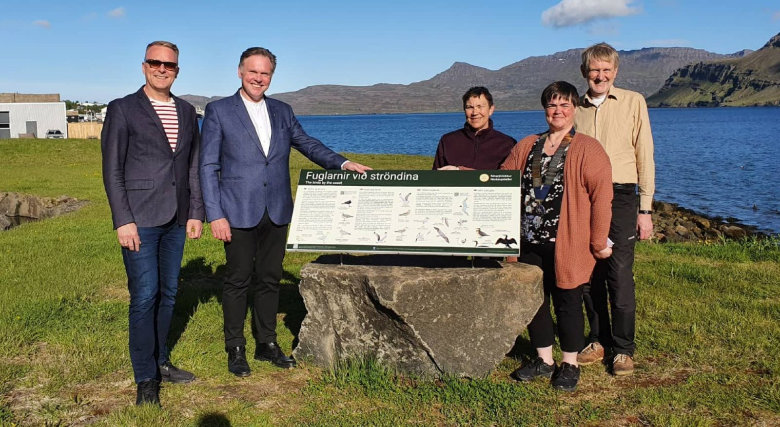Guðmundur R. Gíslason, framkvæmdastjóri SÚN , Jón Björn Hákonarsson bæjarstjóri Fjarðabyggðar og þau Snorri Styrkársson, Vilborg Stefánsdóttir og Áslaug Lárusdóttir frá Rótarýklúbbnum við eitt skiltanna.