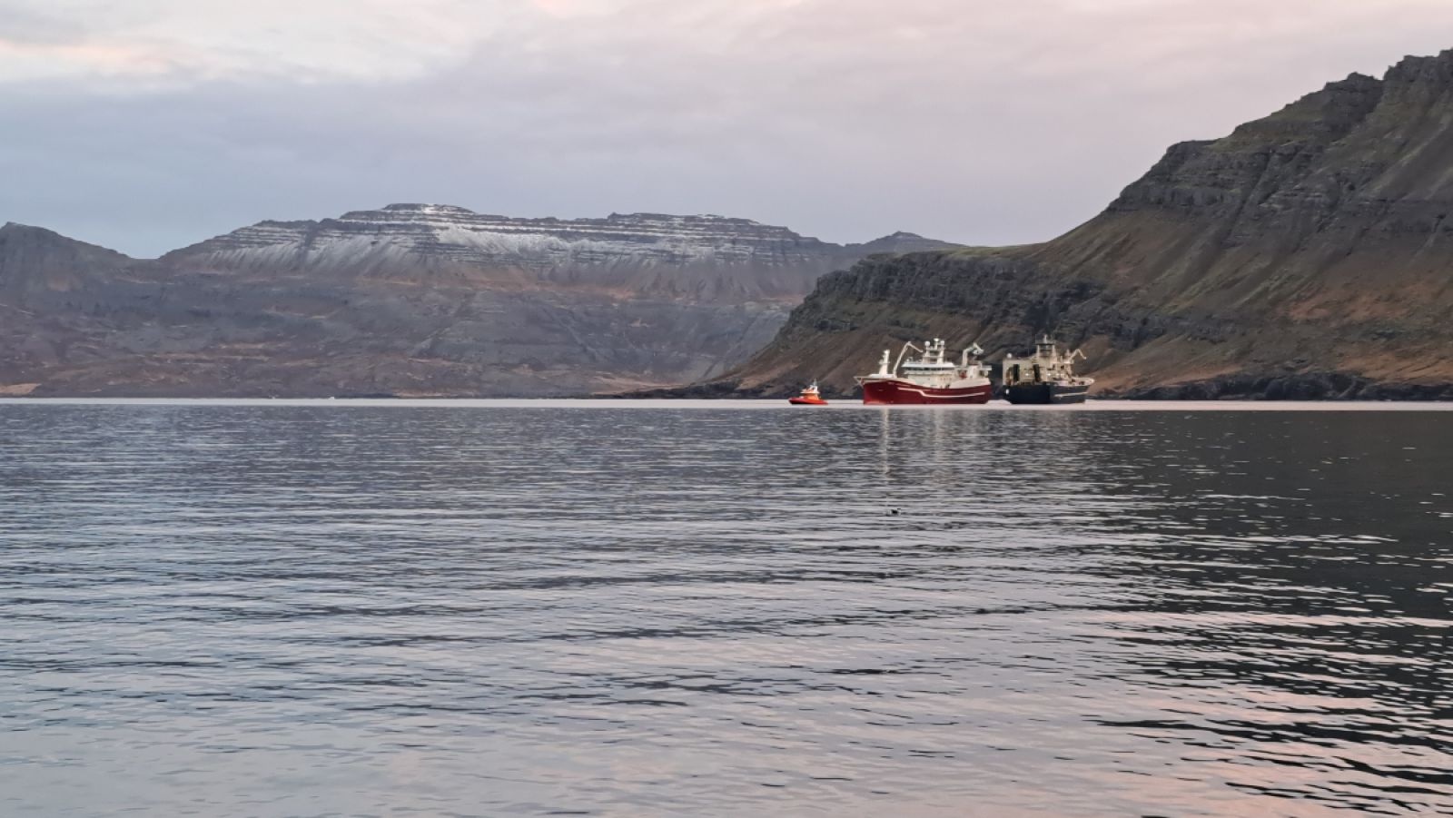 Búið að draga Vilhelm Þorsteinsson EA af strandstað í mynni Norðfjarðar. Bilun í skrúfubúnaði er líkast til um að kenna. Mynd Hjalti Stefánsson