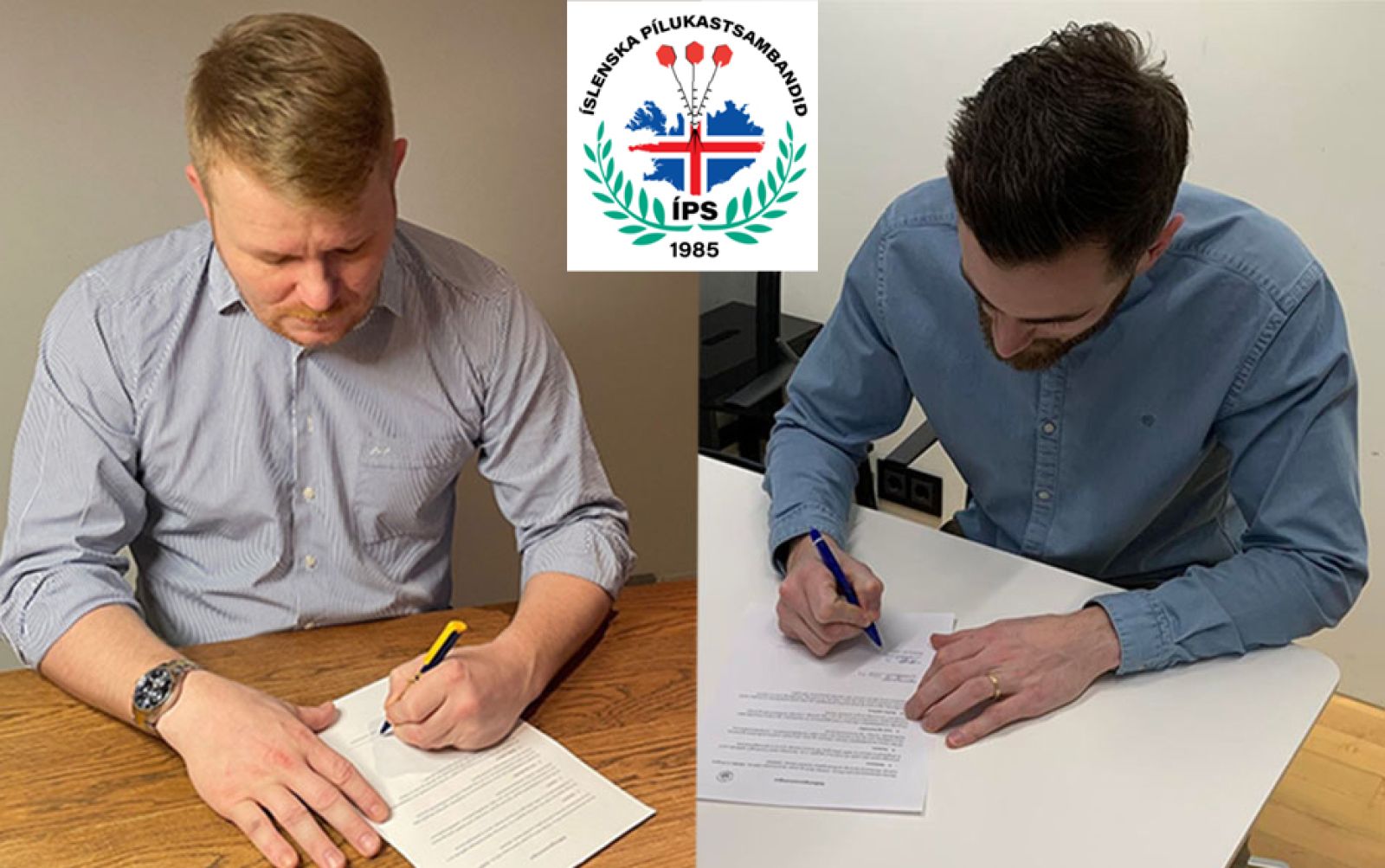 Frá undirritun samningsins. Mynd: Íslenska pílukastssambandið.