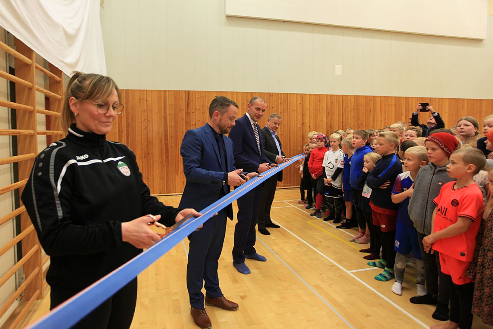 Auður Vala Gunnarsdóttir, yfirþjálfari fimleikadeildar Hattar, Davíð Þór Sigurðarson, formaður Hattar, Guðni Th. Jóhannesson, forseti Íslands og Björn Ingimarsson, bæjarstjóri Fljótsdalshéraðs, klipptu á borða og opnuðu húsið.
