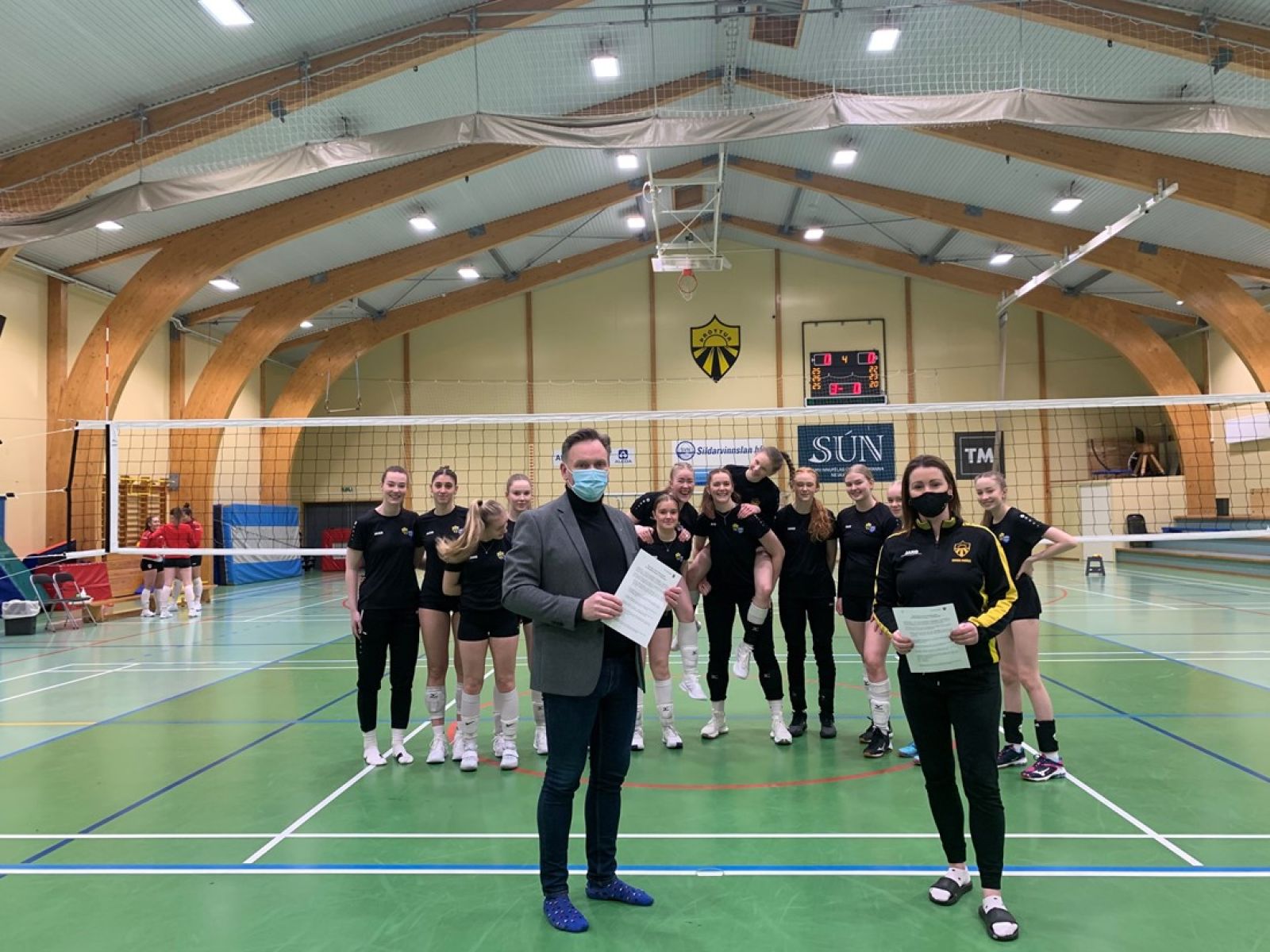 Mynd: Frá undirritun samningsins í síðustu viku. Jón Björn Hákonarson og Sigríður Þórarinsdóttir, framkvæmdastjóri Blakdeildar Þróttar, í bakgrunni má sjá leikmenn Meistarflokks kvenna. Mynd fjarðabyggð.is