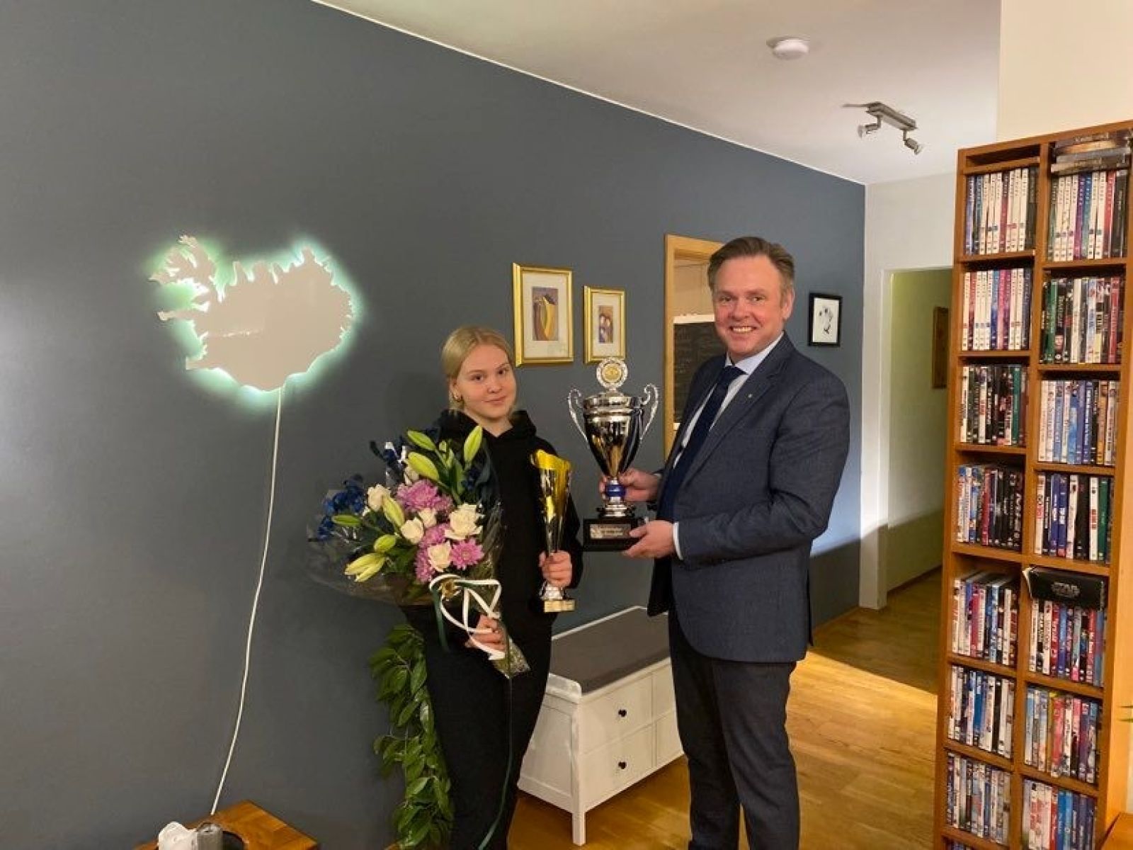 Mynd: Jón Björn Hákonarson afhenti Freyju Karín verðlaunin á heimili hennar á dögunum.