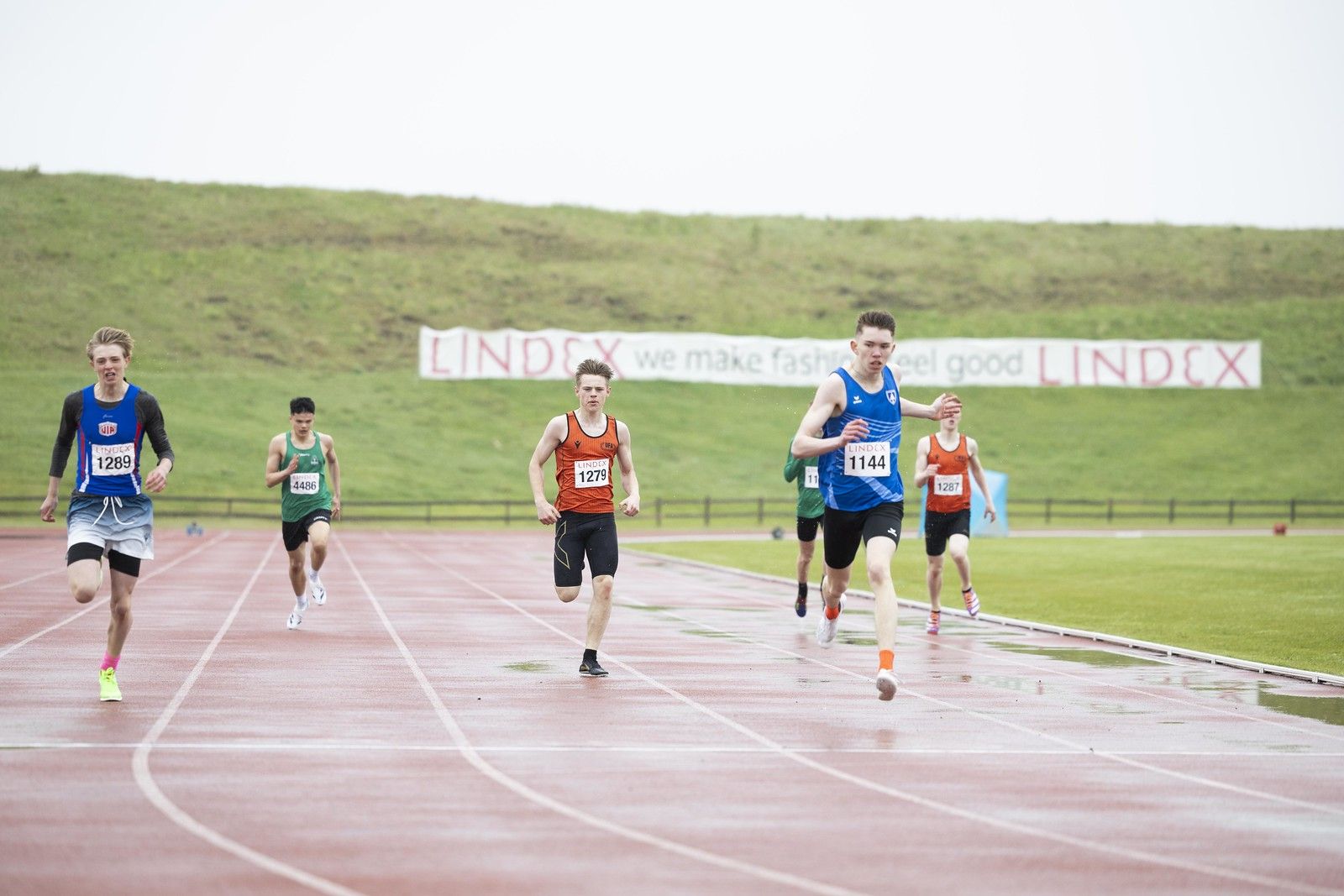 Gabríel Glói kemur í mark í spretthlaupi. Mynd: FRÍ/Hlín Guðmundsdóttir