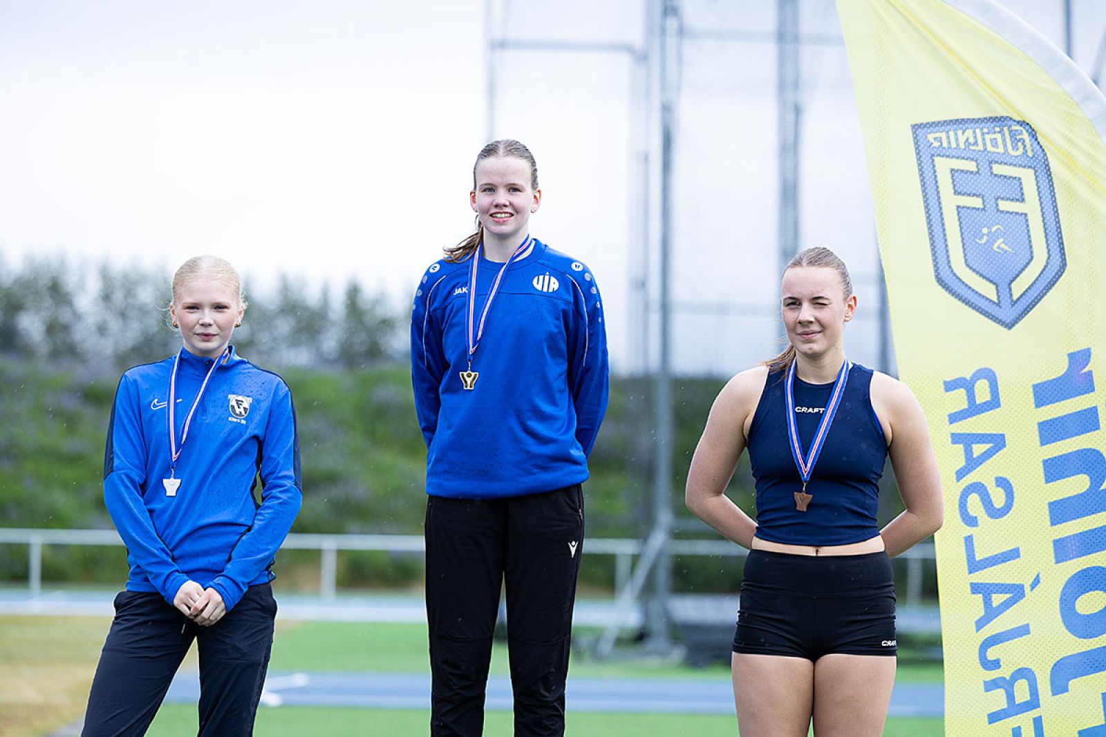 Hafdís Anna, fyrir miðju, á verðlaunapalli á móti fyrr í sumar. Mynd: Frjálsíþróttasamband Íslands.
