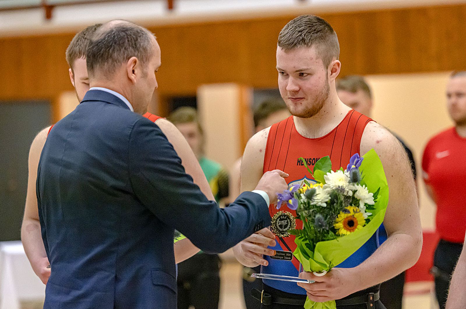 Forseti Íslands, hr. Guðni Th. Jóhannesson, afhendir Þórði verðlaunin fyrir sigurinn í 113. Íslandsglímunni. Mynd: Glímusamband Ísland/Antanas Šakinis