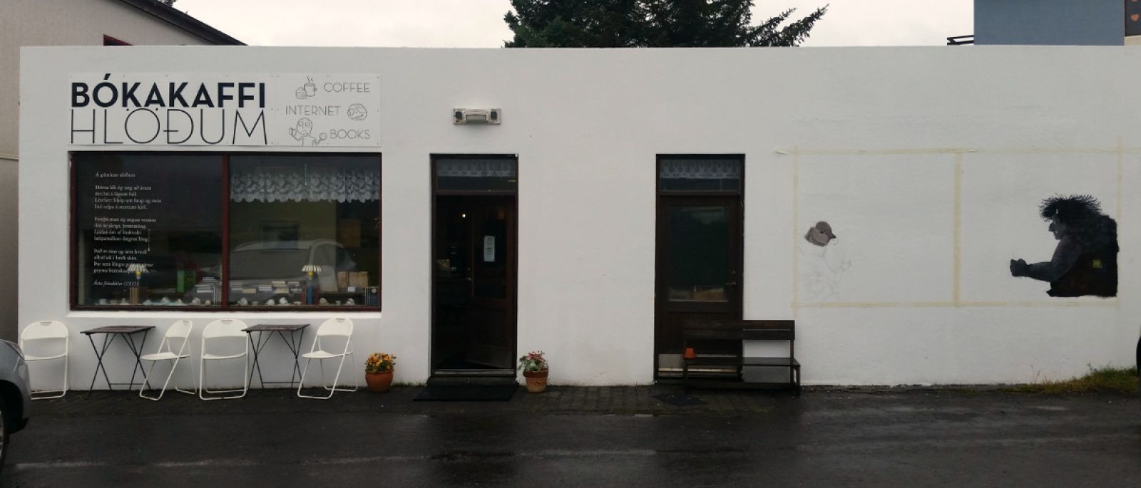 „Hugmyndin kviknaði nú bara þegar ég var að mála framhlið hússins í sumar. Mér fannst hvíti flöturinn svo stór og tilvalið að setja eitthvað á hann,“ segir Gréta Sigurjónsdóttir, eigandi Bókakaffis.