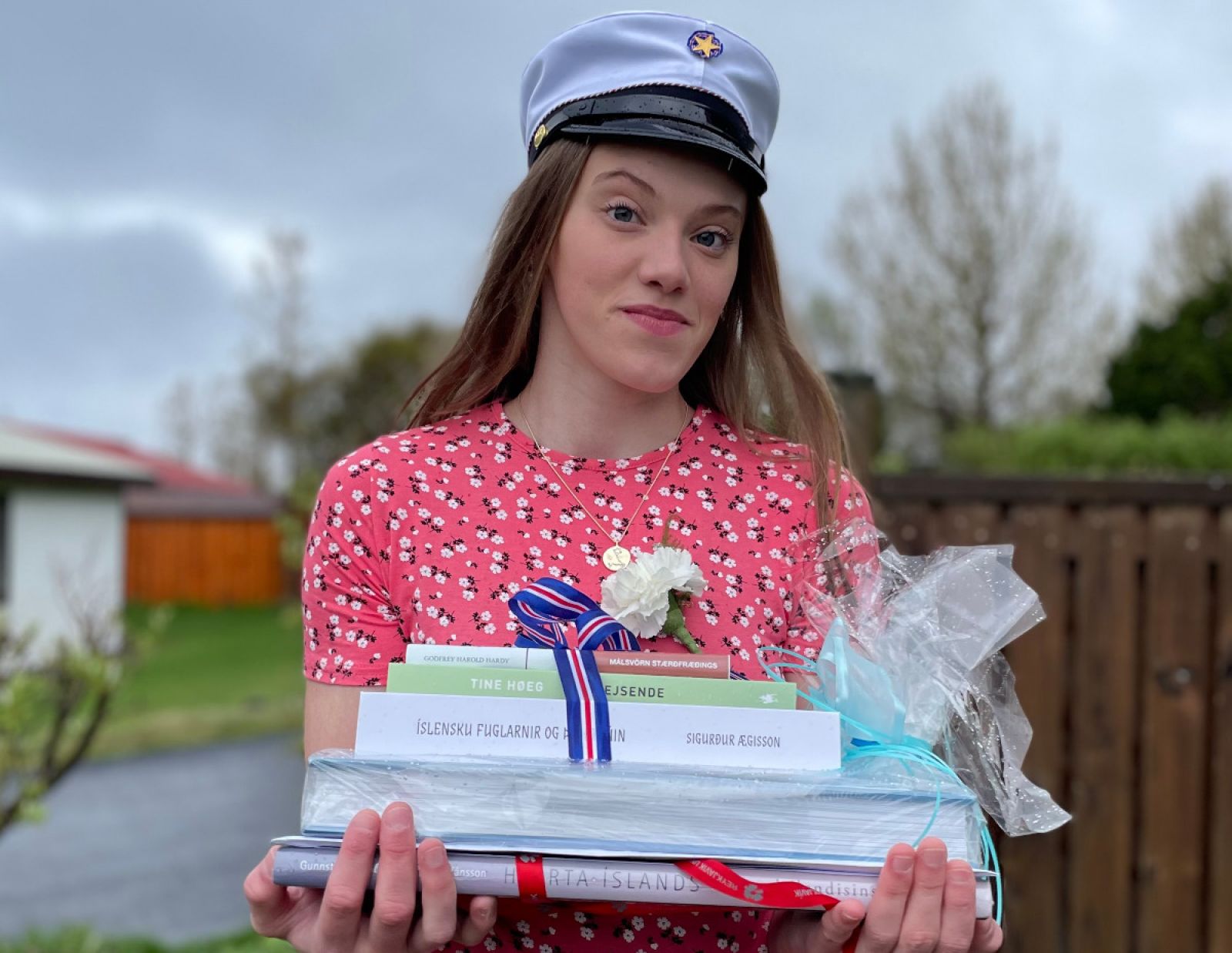 Ester hlaðin gjöfum á útskriftardaginn. Nú tekur hún eins árs frí frá frekara námi. Mynd úr einkasafni