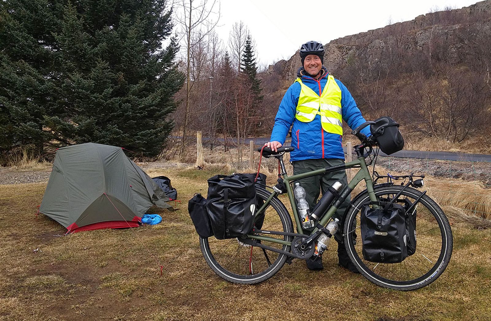 Ralf bendir á tjaldið, hjólið og ferðatöskuna. „Þetta er aleiga mín. 30 kíló í fimm töskum. Þetta er miklu einfaldara líf.“