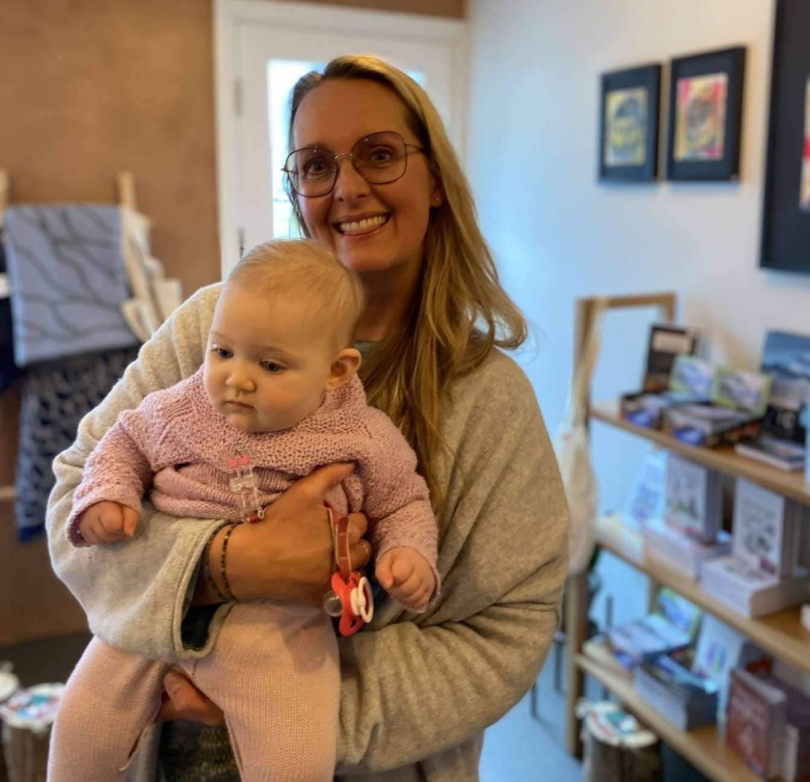 Guðrún Tinna í nýrri verslun sinni með barnabarnið Glóbjörtu Lillý í fanginu. Mynd úr einkasafni