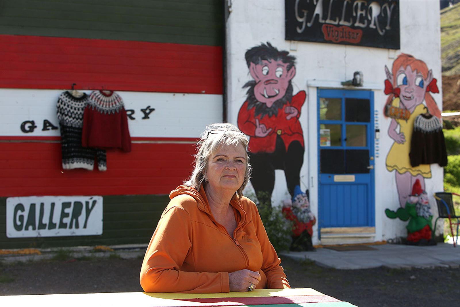 Á regnbogalituðum bekk við skrautmálaðan bílskúr á Seyðisfirði situr Vigdís Helga Jónsdóttir á sumardögum og prjónar eða málar myndir. Í skúrnum, sem skartar Stjána bláa og Ástríki, selur hún handverk sitt, leirverk, prjón og málverk.