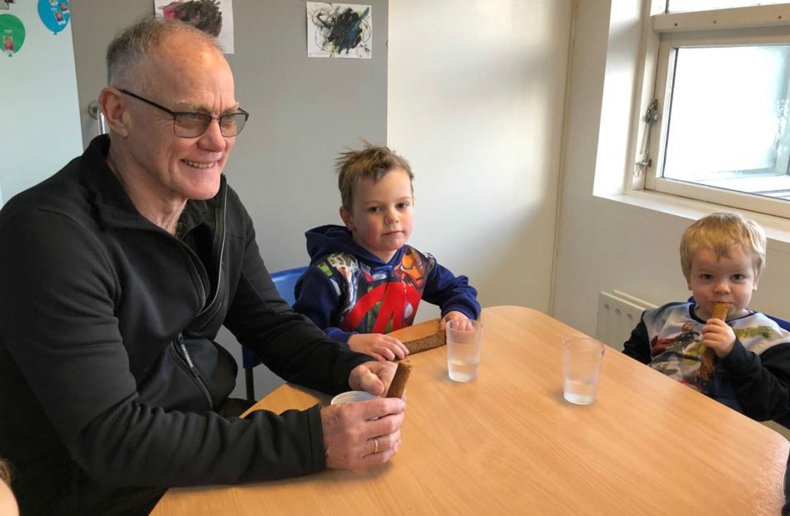 „Krökkunum finnst ótrúlega gaman að fá ömmu og afa í hús, auk þess sem það er ekki á hverjum degi sem við fáum pönnukökur,“ segir Lísa Lotta Björnsdóttir, leikskólastjóri á Lyngholti á Reyðarfirði, en eldri borgurum á staðnum var boðið í sólarpönnukökur í dag á Degi leikskólans.