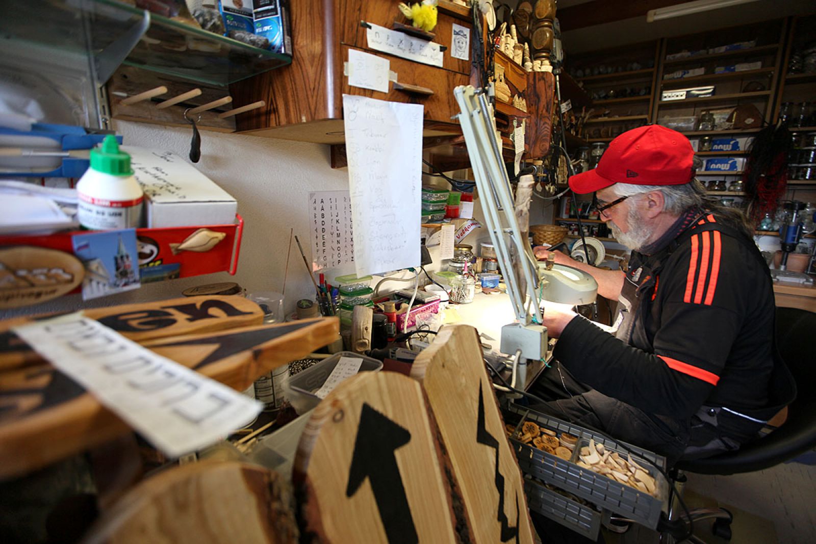 Í sumar verða tíu ár liðin frá því hann fór að opna bílskúrinn sinn og selja þar minjagripi sem hann hefur unnið. „Það var betra að standa upp og gera eitthvað heldur en liggja í rúminu og þiggja bætur,“ segir hann.