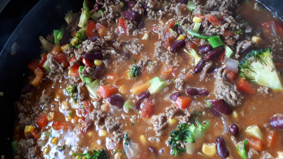 Brúna hakkið og krydda með kryddblöndunni og salt og pipar. Bæti út í dósamatnum og leyfi þessu að malla meðan ég sker niður grænmetið sem ég bæti út í jafnóðum. Látið malla í djúpri pönnu lokið lagt yfir að hluta uþb í 20 mínútur þegar allt er komið útí vökvinn að mestu uppgufaður. - jafnvel betra upphitað daginn eftir.