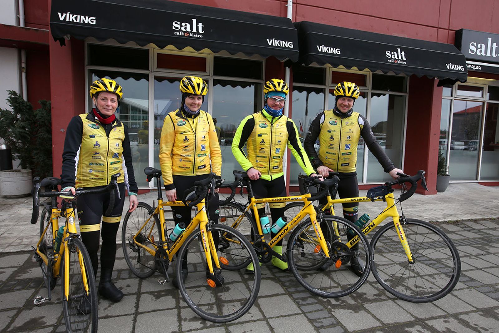 Fjórir gulklæddir hjólreiðamenn hafa vakið athygli austfirskra vegfarenda í dag og í gær. Þetta eru Færeyingar í árlegri æfingaferð fyrir góðgerðahjólreiðar til Parísar undir merkjum Team Rynkeby.