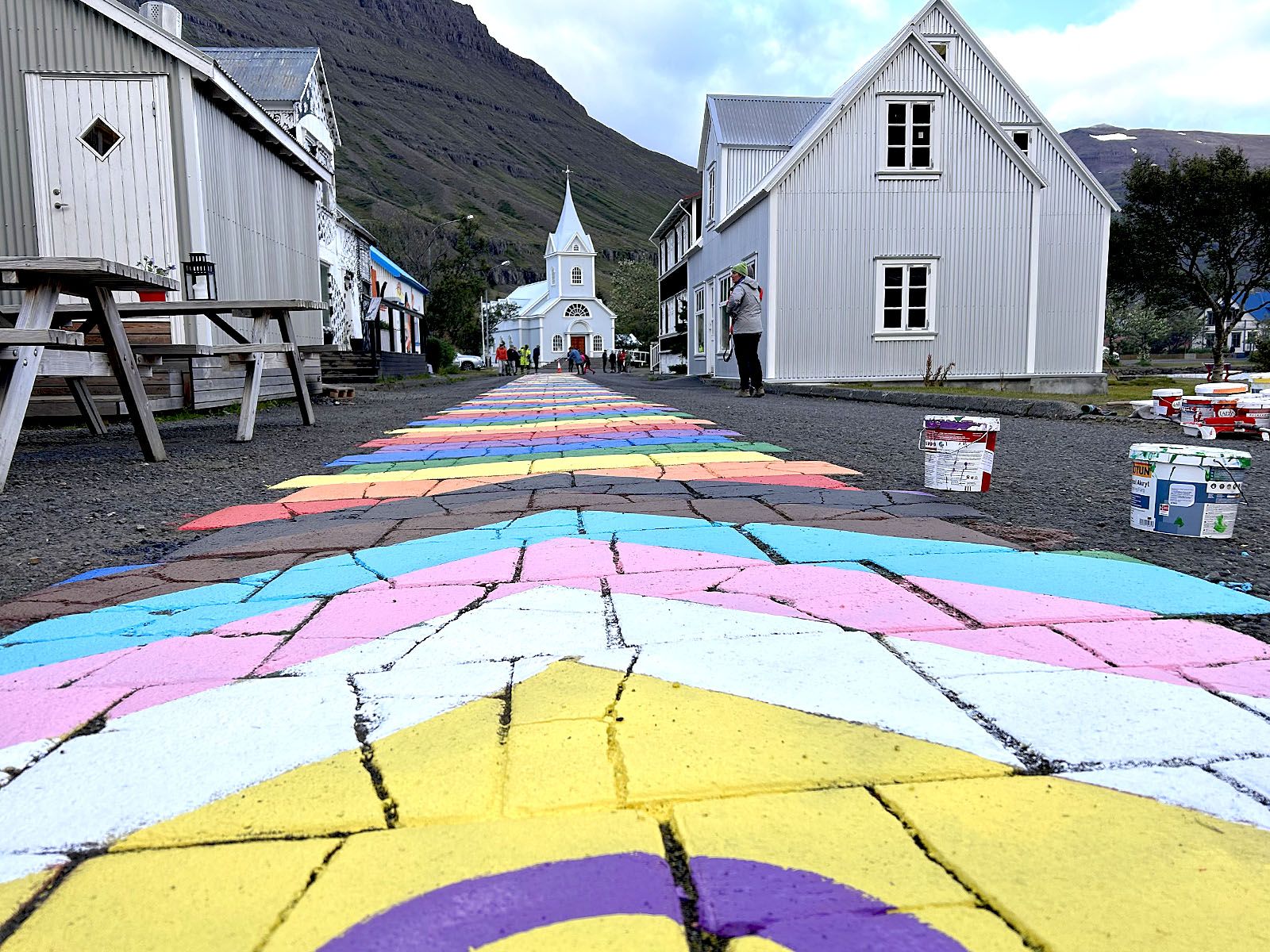 Bætt hefur verið í litina í Norðurgötu á Seyðisfirði, eða Regnbogagötunni. Gleðigangan Hýr halarófa á sér þar upphaf og endi á morgun.