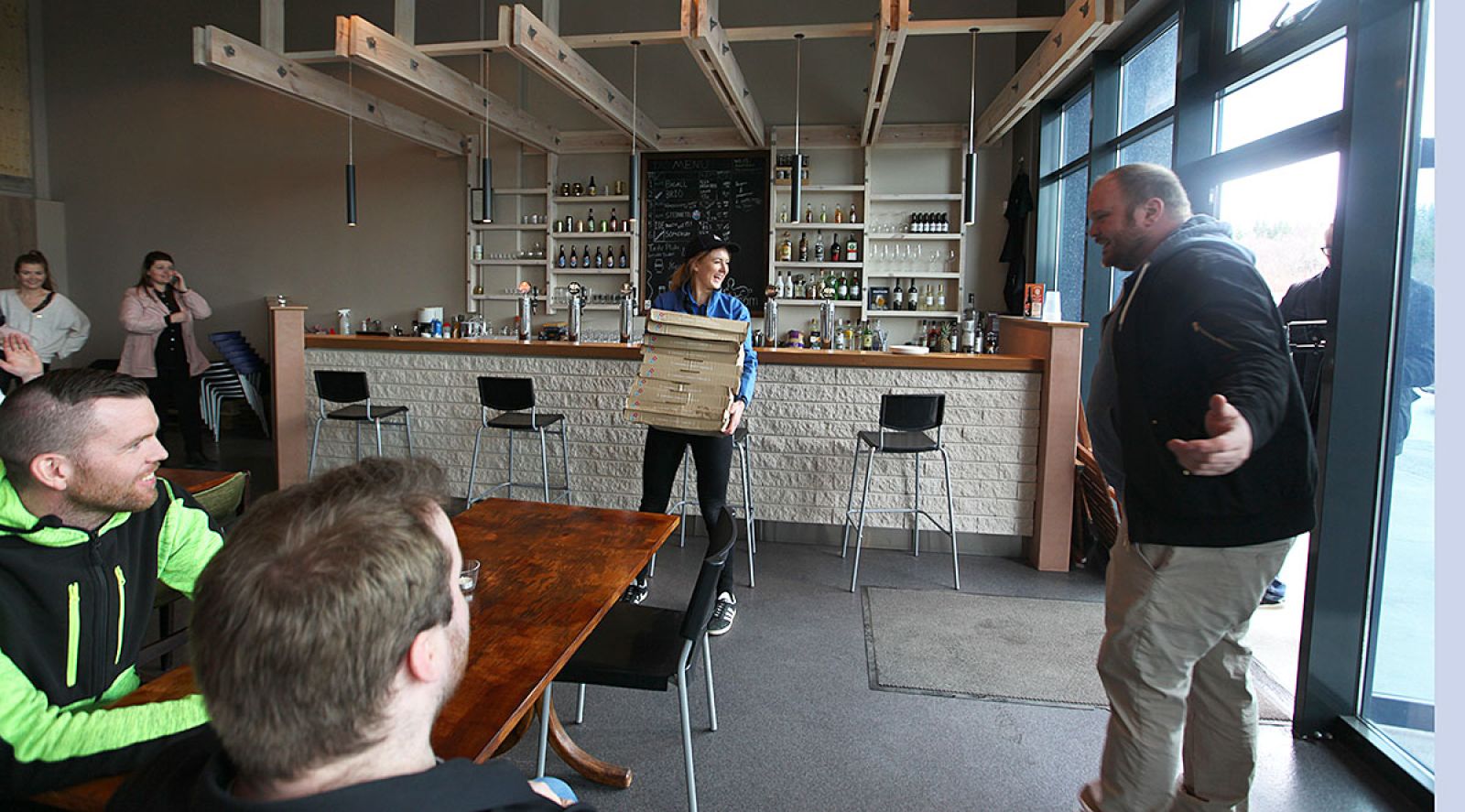 Anna Fríða Gísladóttir, markaðsstjóri Dominos, kom með hádegisfluginu á mánudag með sendingu til Odds og vina hans sem hittust á Aski Taproom.