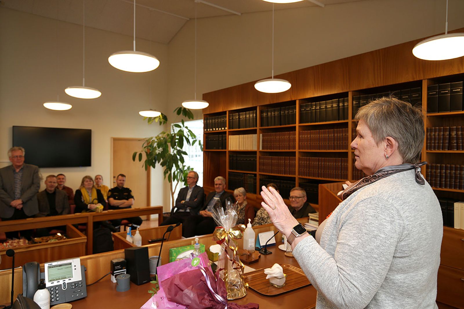 Síðasti starfsdagur Rannveigar var í gær og var hún kvödd með „mjög hóflegu hófi“ eins og dómstjórinn Ólafur Ólafsson orðaði það, í dómssalnum áður en hann færði Rannveigu kveðjugjöf.