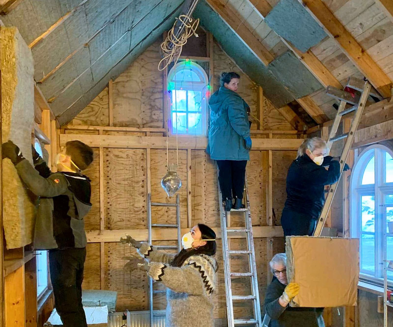 En þótt ytra byrðið væri að mestu tilbúið var mikið verk inni. Um 30 manna hópur hittist fyrst um miðjan janúar til að byrja að einangra kirkjuna. Að því hefur verið unnið undanfarna mánuði og um helgina er framundan lokahnykkurinn. Hópurinn hefur jafnan hist í kaffi eftir vinnudaga sína en nú verður gengið lengra með grillveislu.