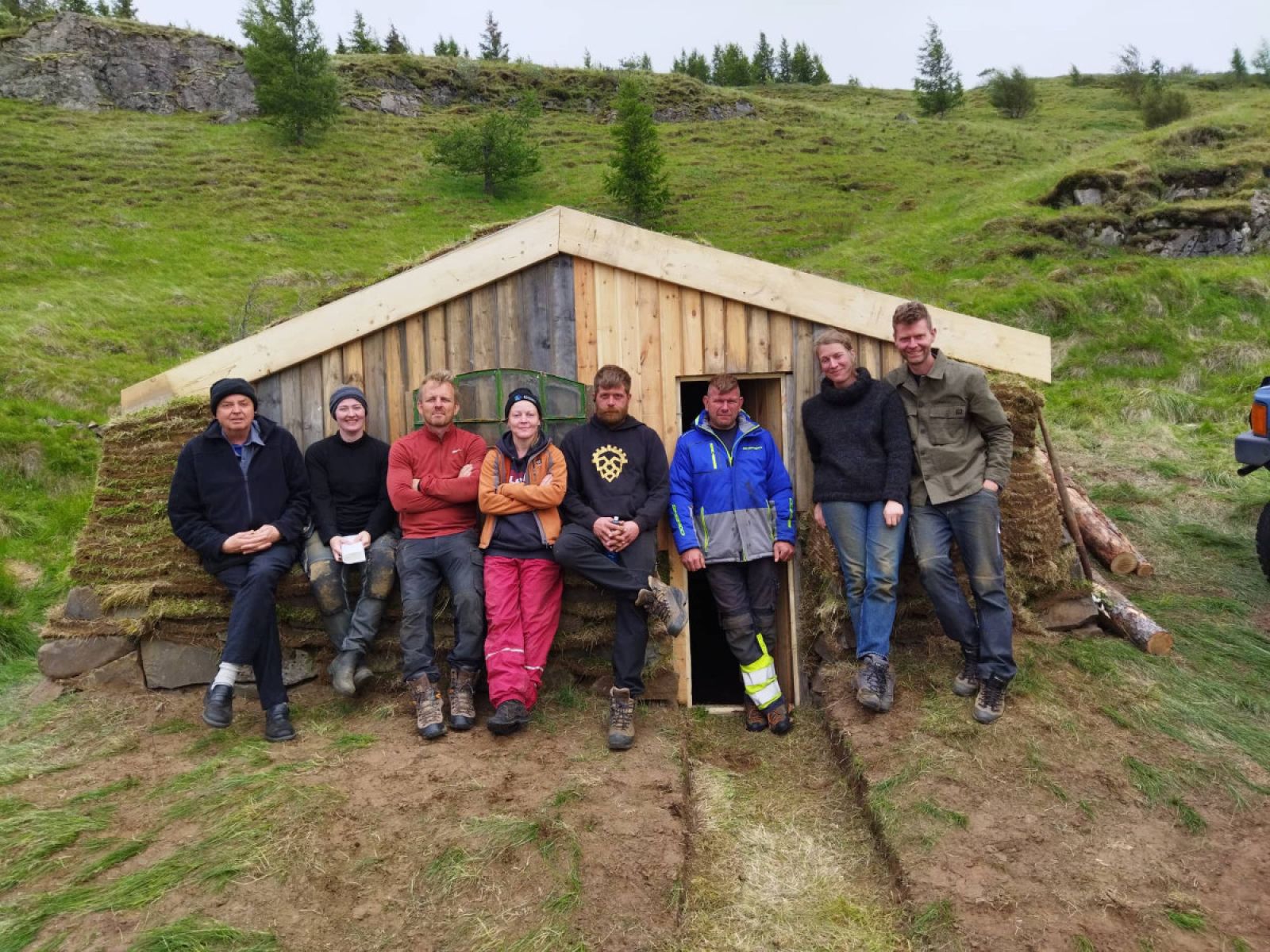 Þorvaldur ásamt þeim einstaklingum sem lærði gömlu handverkin við torfhleðslur í vikunni. Gamli reykofninn orðinn eins og nýr. Mynd Ásdís Helga Bjarnadóttir.