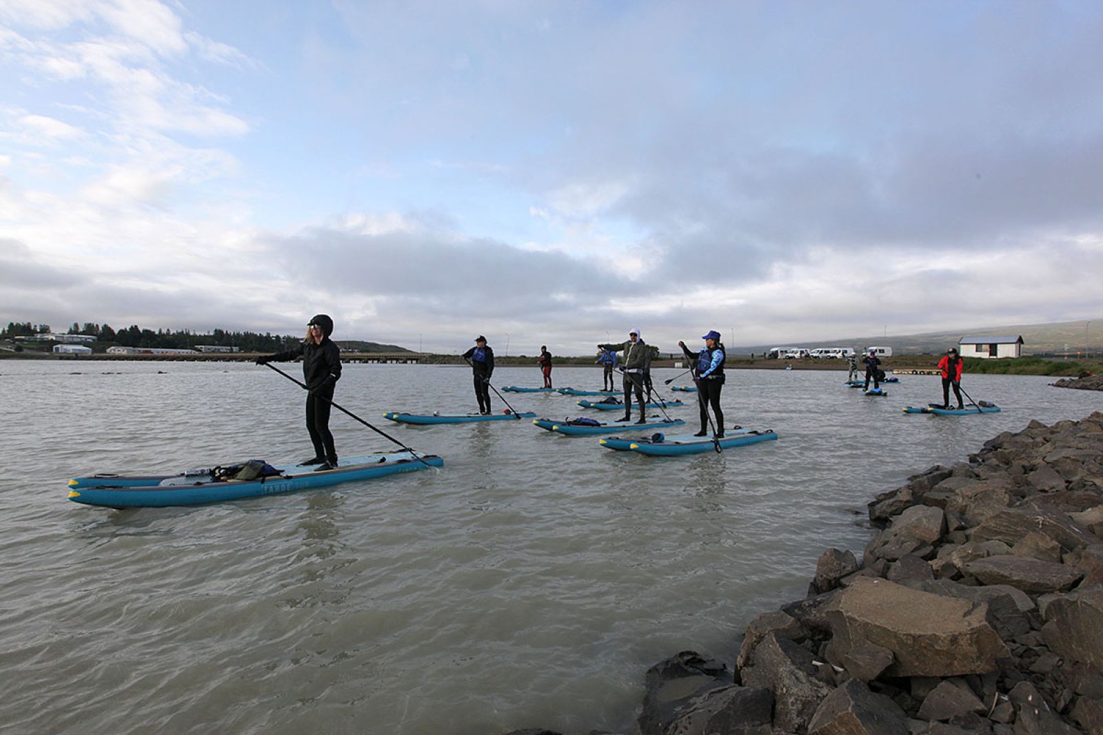 Fimmtán ræðarar frá Texas í Bandaríkjunum fóru í gær á róðrabrettum frá Egilsstöðum inn í Atlavík. Leggurinn var hluti af Íslandsferð þeirra sem farin er til að vekja athygli á og safna fé til styrktar sem styðja við fjölskyldur krabbameinssjúklinga.