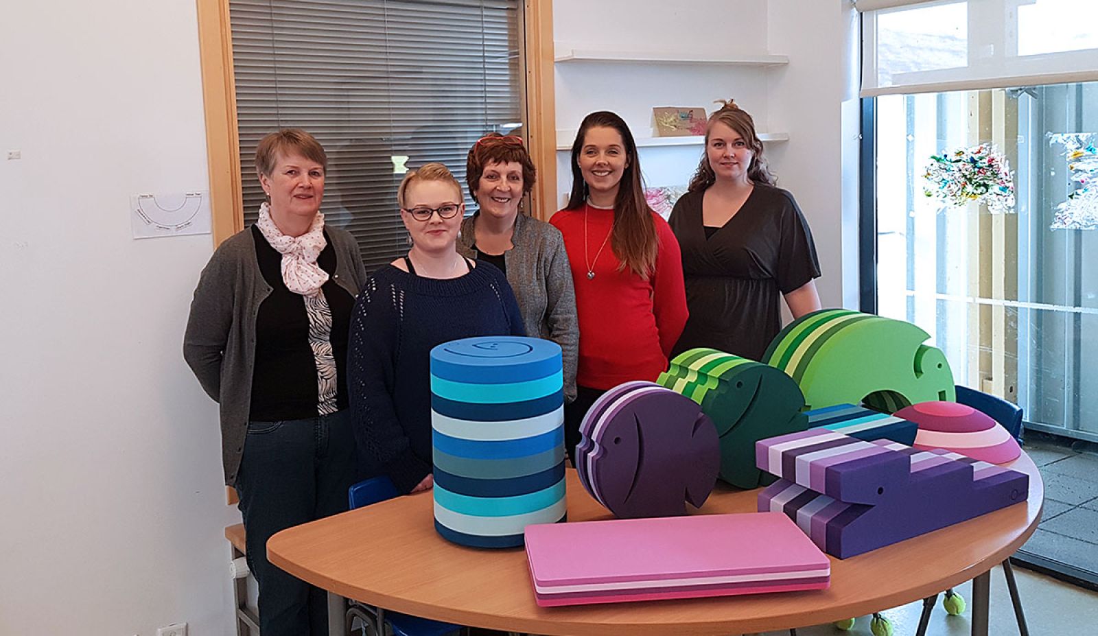 Frá afhendingu leikfanganna, frá vinstri: Jóhanna Sigfúsdóttir fra kvenfélaginu, Guðlaug Björgvinsdóttir frá foreldrafélaginu, Marleen Meirlain og Harpa Vilbergsdóttir frá kvenfélaginu og Sigrún Yrja Klörudóttir frá foreldrafélaginu. Mynd: Aðsend