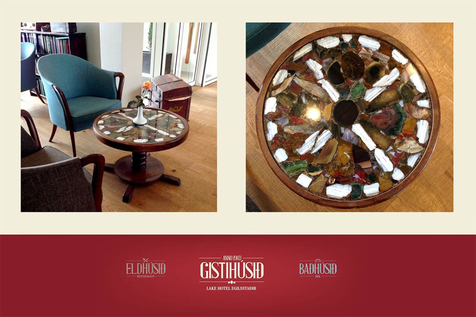 Borðið er samskonar og þrjú önnur borð sem eru í setustofunni. Þau eru unnin af Gunnari Gunnarssyni, afa Huldu, sem kallaður var Gagarín.