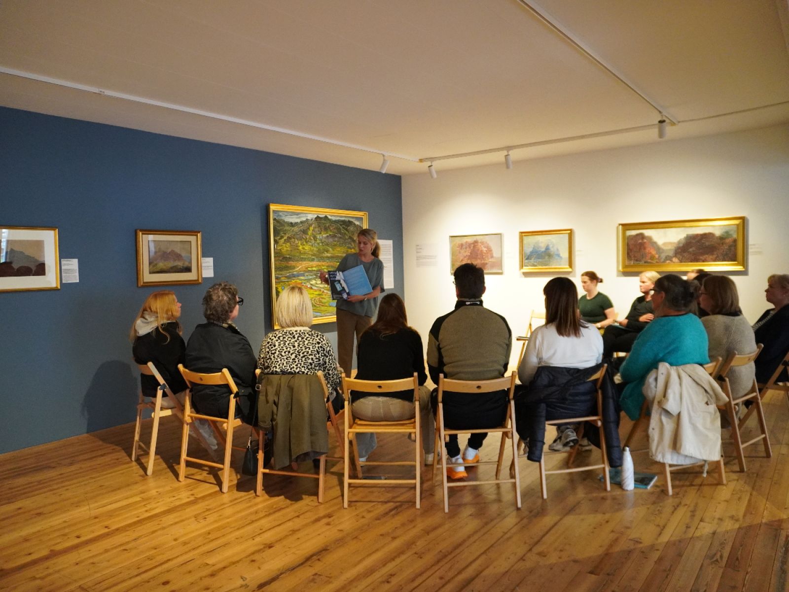 Nokkrir þátttakendur á námskeiðinu í Skaftfelli reyna hér að átta sig á myndmáli mynda Kjarvals en sýningin Kjarval á Austurlandi hefur þar staðið yfir um hríð. Mynd: Aðsend