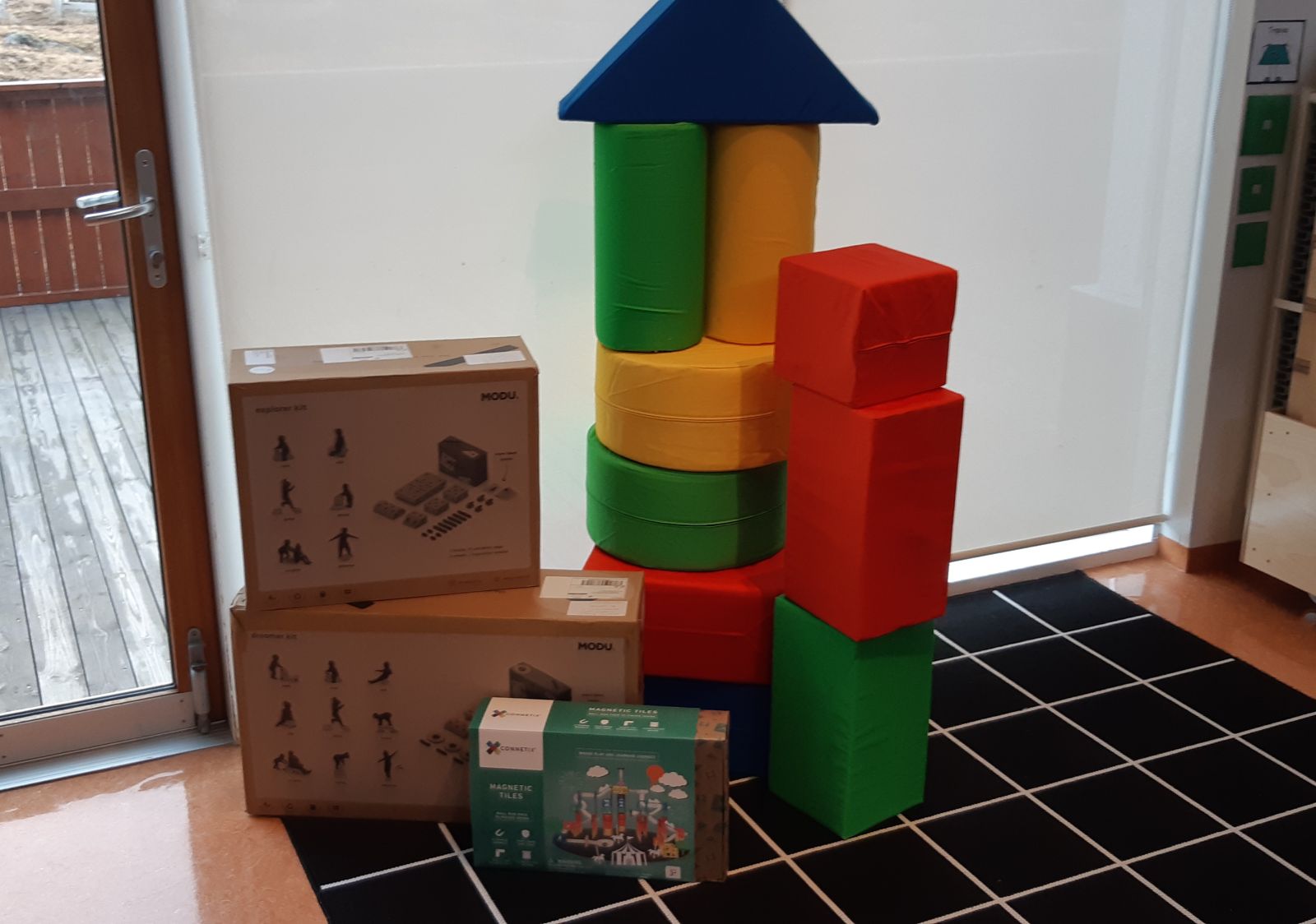Í pakkanum voru mjúkir svampkubbar af allskonar stærðum og gerðum sem hægt er að leika sér með og byggja úr. Leikskólabörnin fengu líka tvö sett af MODU kubbum sem hafa endalausa möguleika og eru tilvaldir fyrir opinn leik og skapandi hugsun. Krakkarnir geta leyft ímyndunaraflinu að njóta sín þar sem hægt er að setja saman allskonar útfærslur með pinnum og hjólum sem fylgja með. Að endingu er það svo segulkubbarnir þar sem hægt er að setja saman á fjölbreyttan hátt. Eitt settið er kúlubraut en hitt settið eru segulkubbar þar sem hægt er að byggja allskonar stóra og smáa hluti.