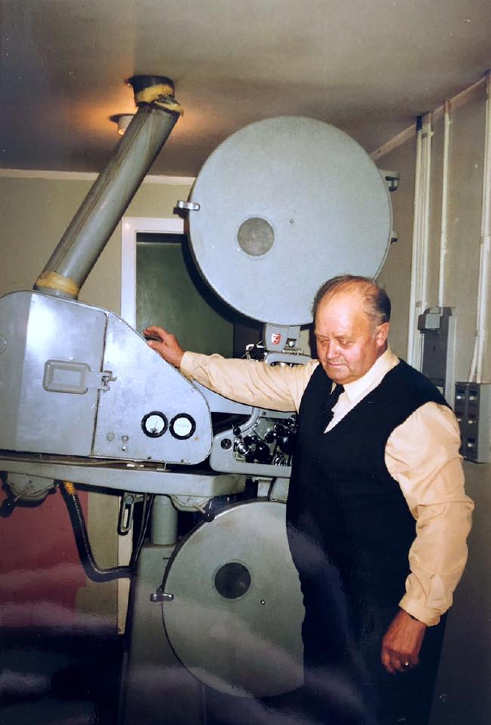 Halldór Friðriksson fyrrum umsjónarmaður Valhallar með gömlu sýningavélinni. Myndin er aðsend.