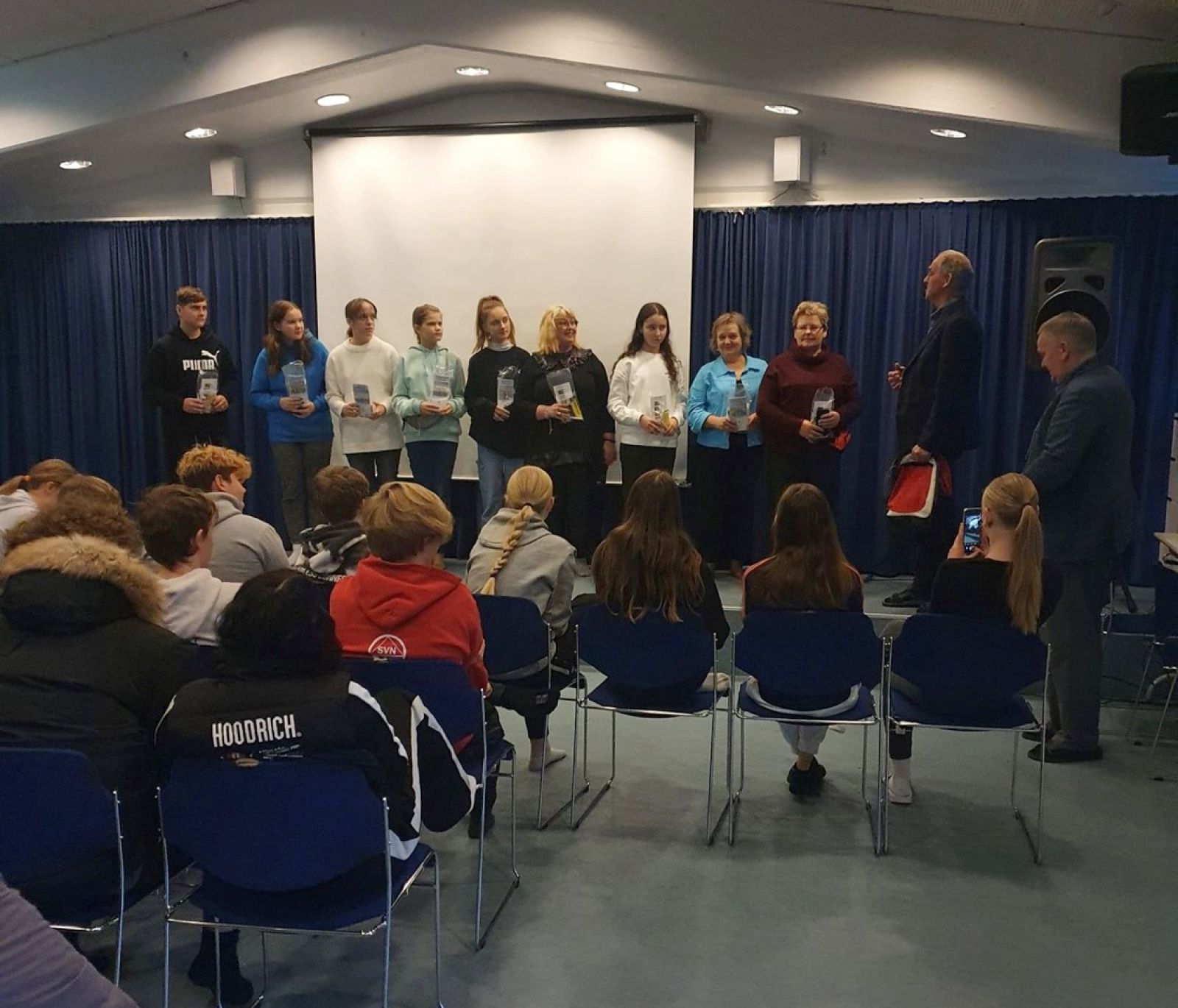 Klykkt var út með hófi í Eskifjarðarskóla þar sem Þóroddur Helgason, fræðslustjóri Fjarðabyggðar, afhenti þeim góðar gjafir í kveðjuskyni en þessi heimsókn sem og heimsókn Eskfirðinganna til Lettlands var styrkt af Nord Plus sjóðnum. Sá sjóður er hluti menntaáætlunar Norrænu ráðherranefndarinnar og á að stuðla að samstarfi í menntun á Norðurlöndum og í Eystrasaltslöndum.
