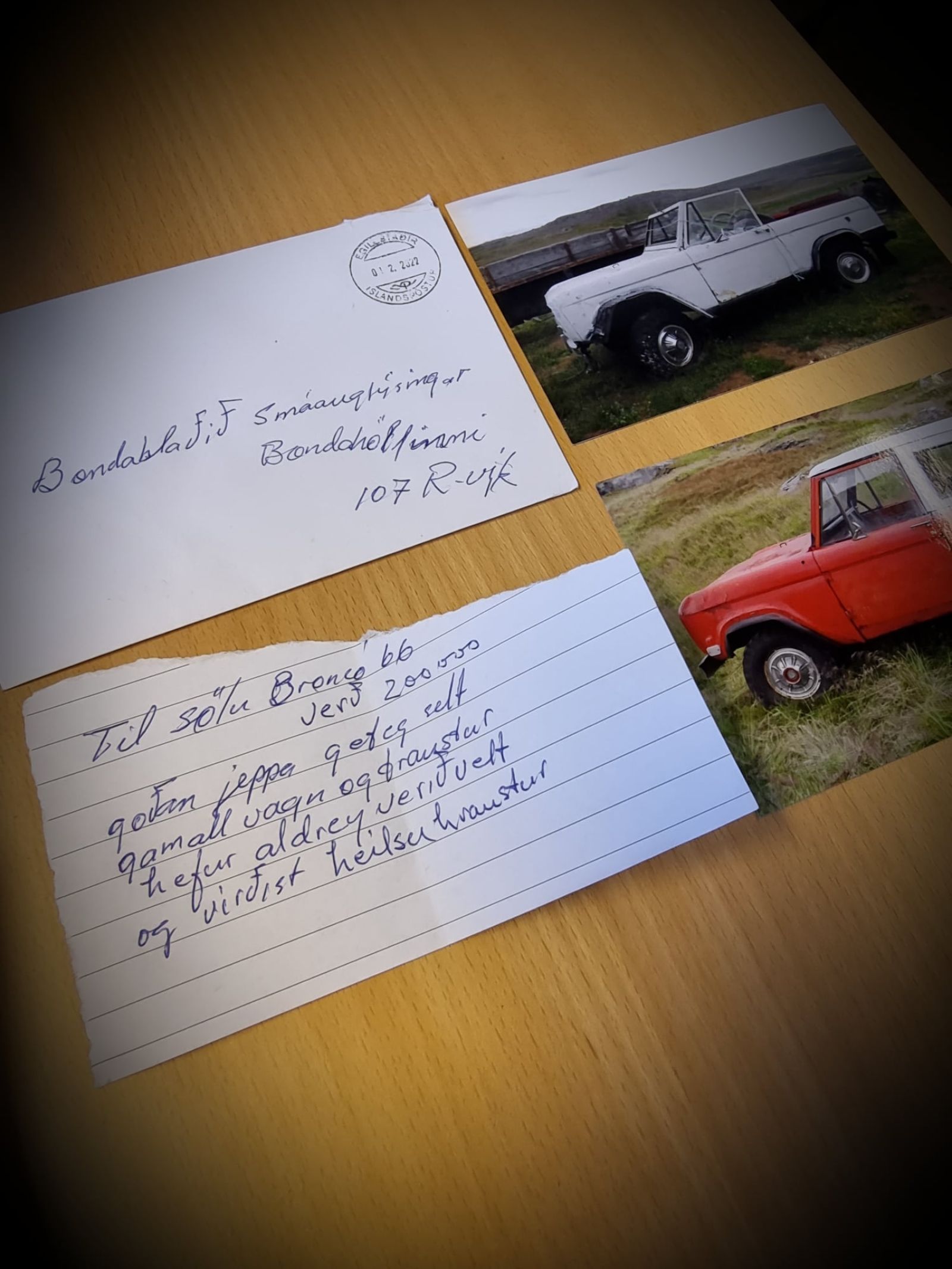 Smáauglýsingadeild blaðsins, sem er einn vinsælasti hluti þess, hafði borist bréf frá manni sem vildi selja Bronco-bifreið, árgerð 1966.
