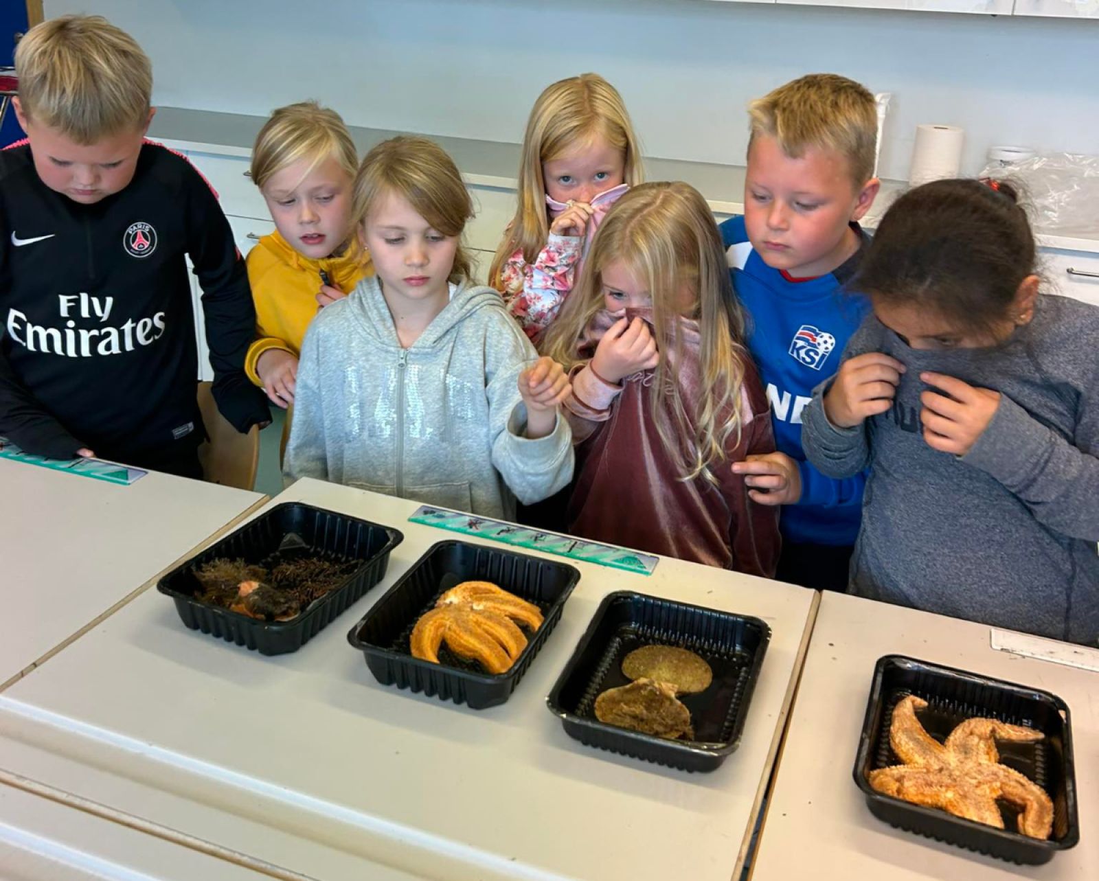 Eins og sjá má á meðfylgjandi mynd, sem tekin var af Guðrúnu Smáradóttur umsjónarkennara, var lyktin ekki að skapi allra í bekk 2. GS þegar kom að þeim að skoða dýrin en börn í öðrum bekkjum fengu líka að komast í návígi við þessar kynjaverur hafsins. Sjálf segir Ólöf Þóranna að lyktin hafi ekki komið í veg fyrir að börnin hafi verið hugfangin allan tímann.