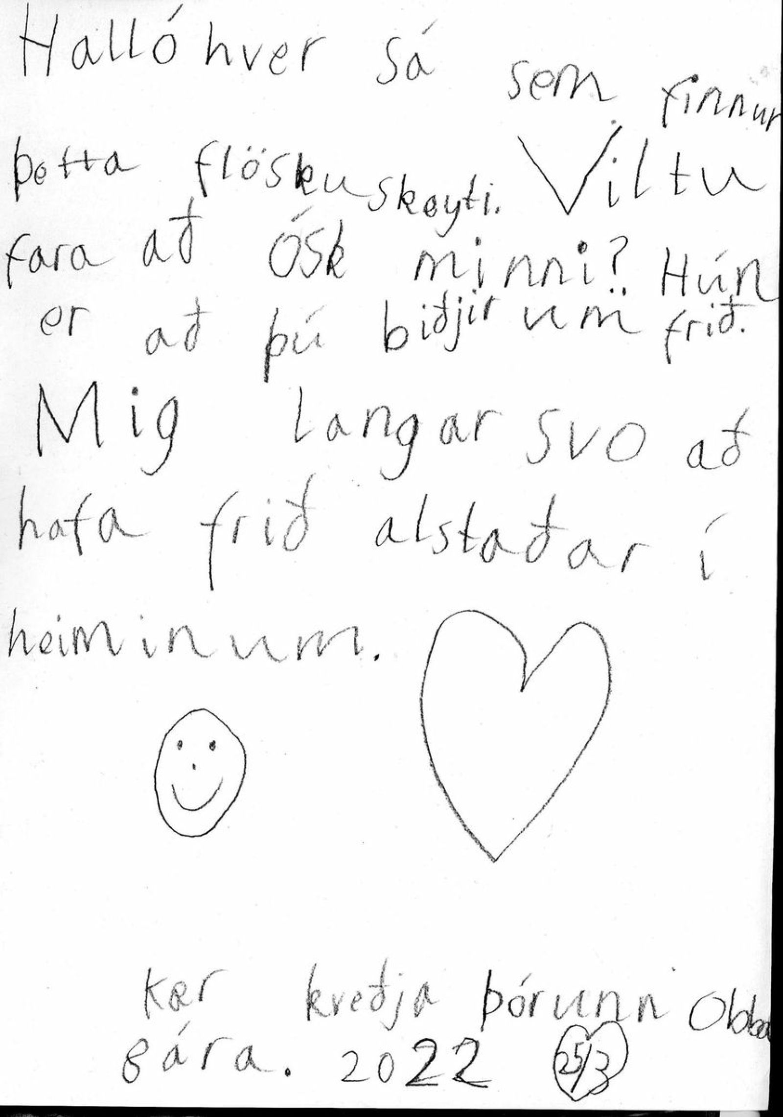 Halló, hver sá sem finnur þetta flöskuskeyti. Viltu fara að ósk minni? Hún er að þú biðjir um frið. Mig langar svo að hafa frið allstaðar í heiminum. Kær kveðja, Þórunn Obba, 8 ára.