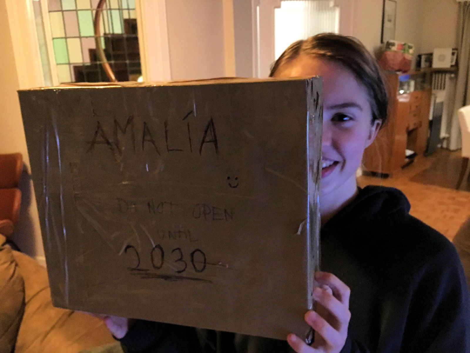 „Verkefnið á ég að geyma óopnað fram til ársins 2030, eða í tólf ár, en þá verð ég sjálf 25 ára gömul. Þá get ég séð hvernig ég hugsaði þegar ég var yngri og hvort hugsunin mín varðandi eigin heilsu hafi breyst mikið,“ segir Amalía Malen Rögnvaldsdóttir, 13 ára stelpa ættuð frá Egilsstöðum, um verkefni sem hún vann í skóla sínum í Brussel.