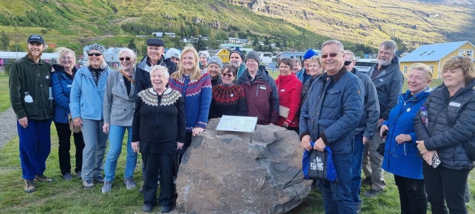 Hópurinn ásamt gestum við afhjúpun minnisvarðans á Seyðisfirði. Mynd: Hjördís Hilmarsdóttir