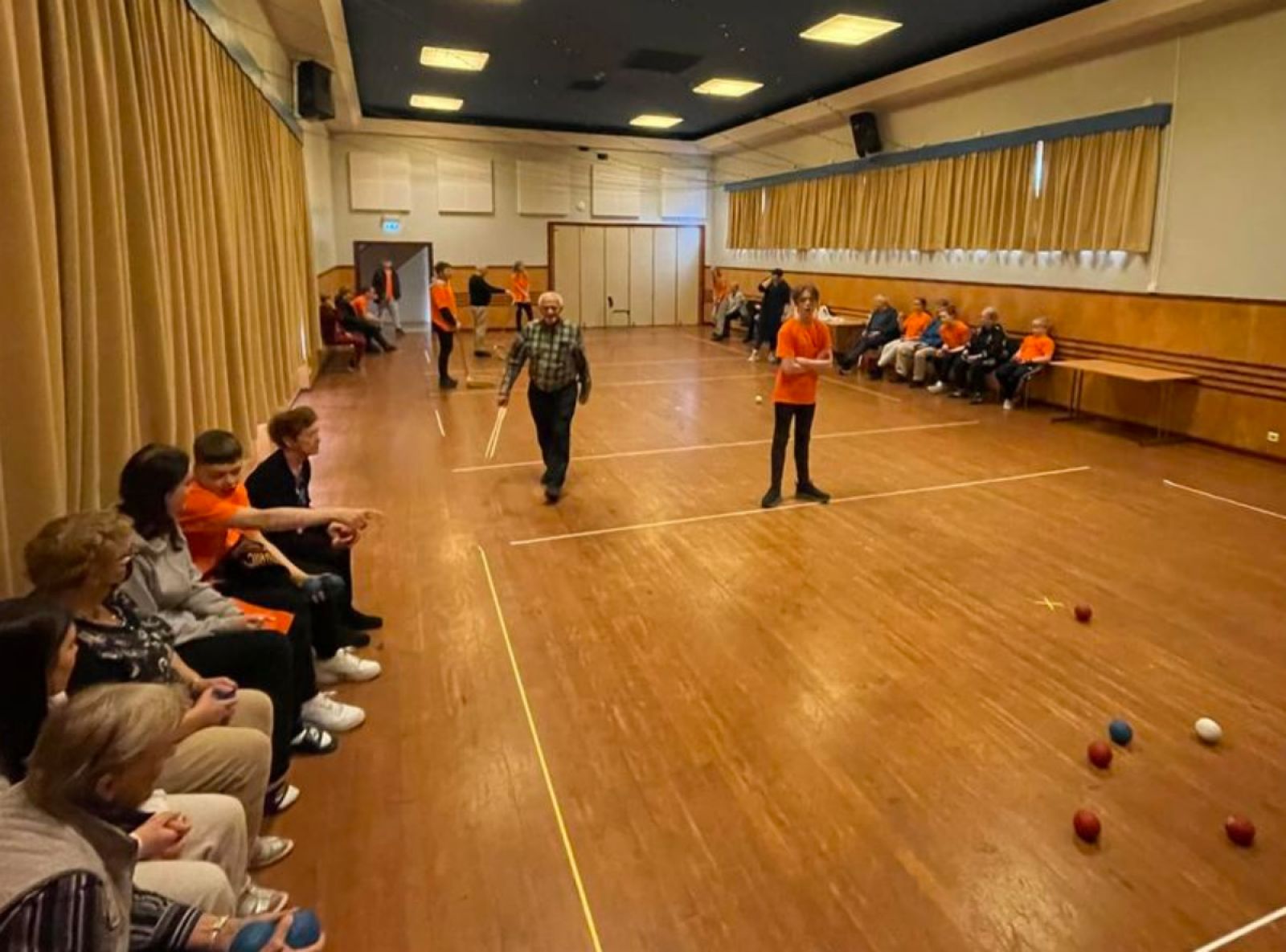 Frá keppni ungmennanna við eldri borgara í boccia fyrr í vikunni. Engum sögum fer af hver bar sigur úr býtum enda skipti það minnstu máli. Aðalatriðið að tryggja vinabönd þessara ólíku hópa. Mynd Vinavikan.