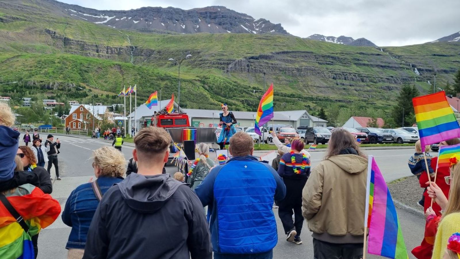 Úr gleðigöngunni á Seyðisfirði síðasta laugardag. Snorri sem áður í broddi fylkingar Mynd: Jóhann Hjalti Þorsteinsson