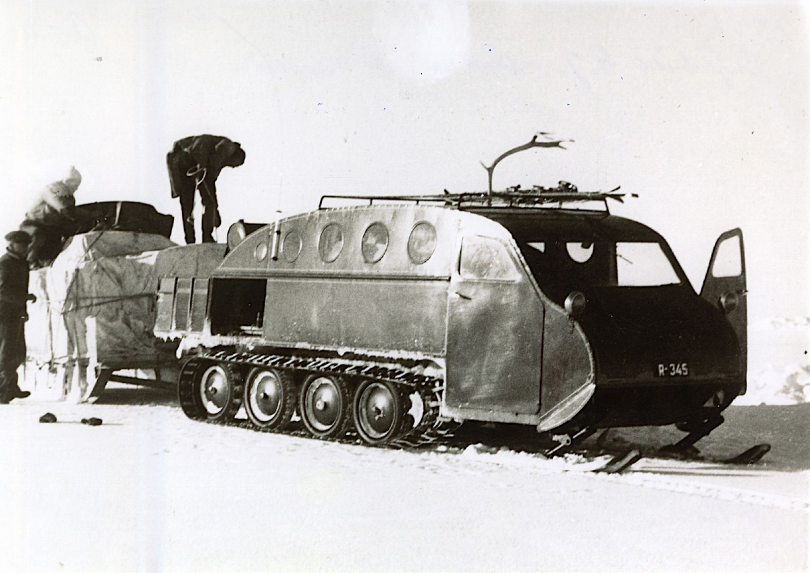 Myndin er af snjóbíl Guðmundar Jónassonar. Verið er að ganga frá varningi á sleða sem notaður var til flutninga aftan í snjóbílnum. Mynd: Ljósmyndasafn Austurlands.
