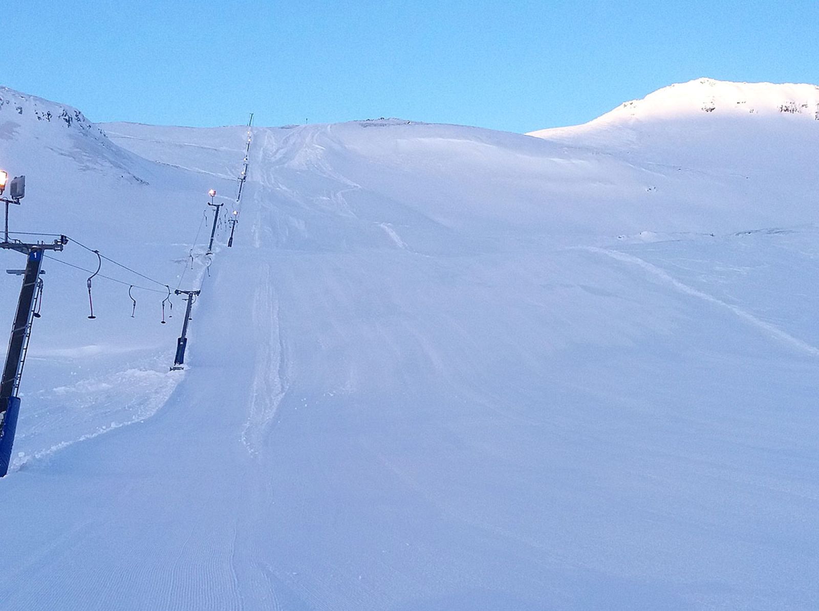 Aðeins neðri hluti svæðisins er opinn en Agnar segir eftir að laga til í þeim efri. Færið er fínt. „Þetta er troðinn púðursnjór sem marrar í þegar maður gengur. Frosinn en samt mjúkur. Það er dásamlegt færi.“