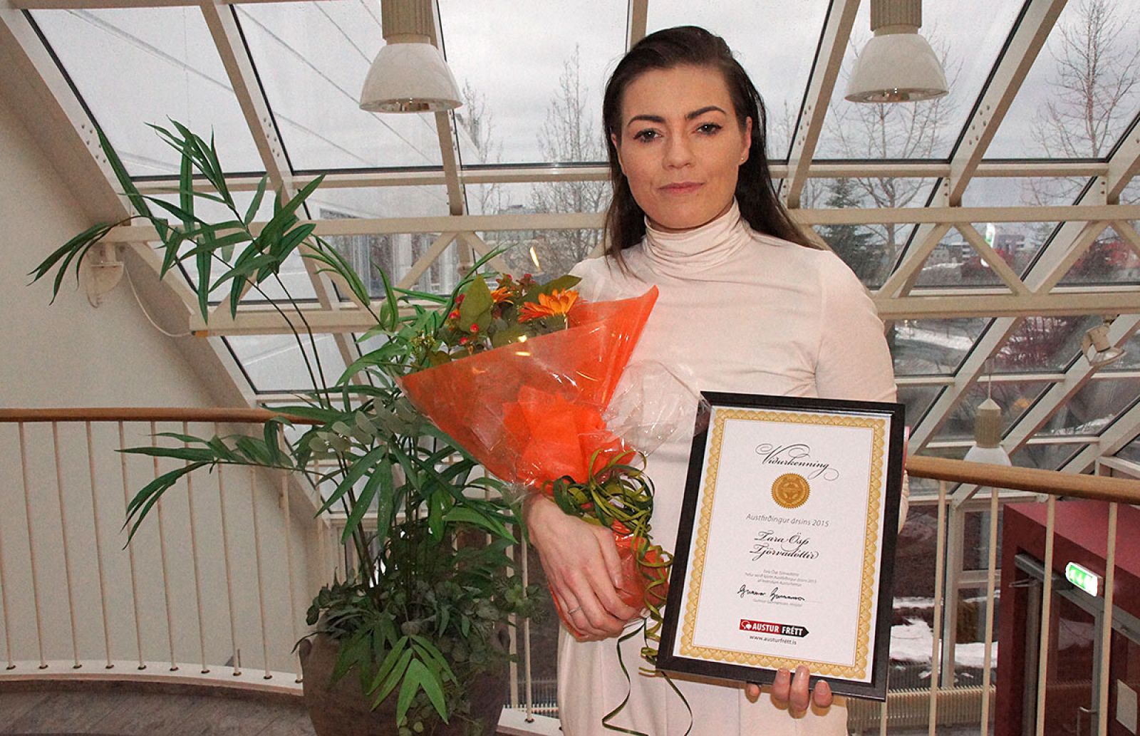 Tara fékk viðurkenningarskjal og blómvönd frá Austurfrétt og gjafabréfið silfurreyni frá Gistihúsinu á Egilsstöðum með gistingu, þriggja rétta kvöldmat og aðgengi að baðhúsinu fyrir tvo.