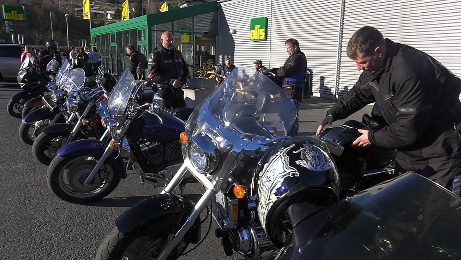 Drekar huga að hjólum sínum við Olís á Reyðarfirði. Mynd: Hjalti Stefánsson