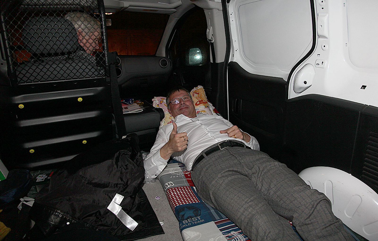 Preben Jón leigði sér því lítinn sendiferðabíl og kom fyrir í honum dýnu. „Þetta er tjalddýna sem dóttir mín hefur notað á íþróttaferðalögum. Við höfum rifist um hvort hún væri brúkleg þannig ég varð að sannreyna það og finnst hún fín.“