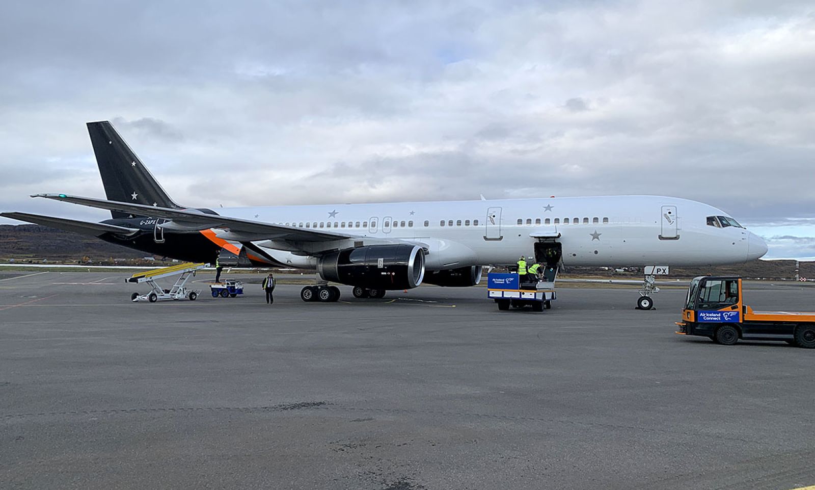 Eftir því sem Austurfrétt kemst næst var í fluginu 60-80 manna starfslið og talsverður búnaður sem dreifðist í fjóra flutningabíla. Vélin lenti skömmu upp úr hádegi en hún kom frá Stanstead-flugvelli í Lundúnum.