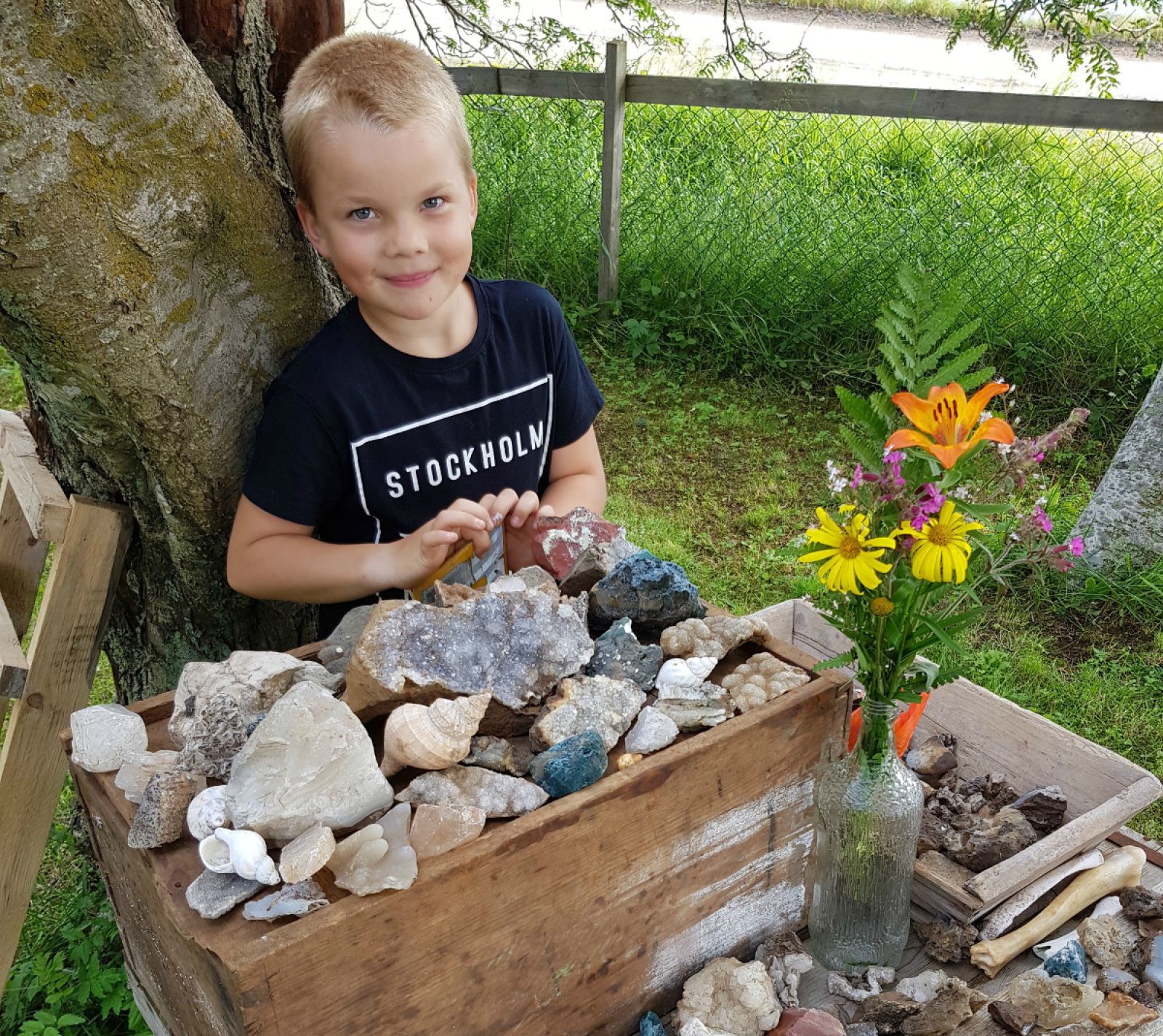 Við fórum svo í fjallgöngu í gær og fundum alveg fullt af steinum. Hann var að velta því fyrir sér að selja þá til að safna sér fyrir fótboltamóti sem hann er að fara á núna í ágúst. Þegar hann var svo búinn að skola af steinunum tímdi hann því ekki og ákvað frekar að búa til safn. Við fórum í Steinasafn Petru á Stöðvarfirði á mánudaginn og þar sá hann hugmynd sem gæti gengið, fyrst hún gat rekið safn og átt steinana sjálf þá gæti hann það líka. Hann var svo að dunda sér við þetta í allan gærdag, að setja safnið upp.“
