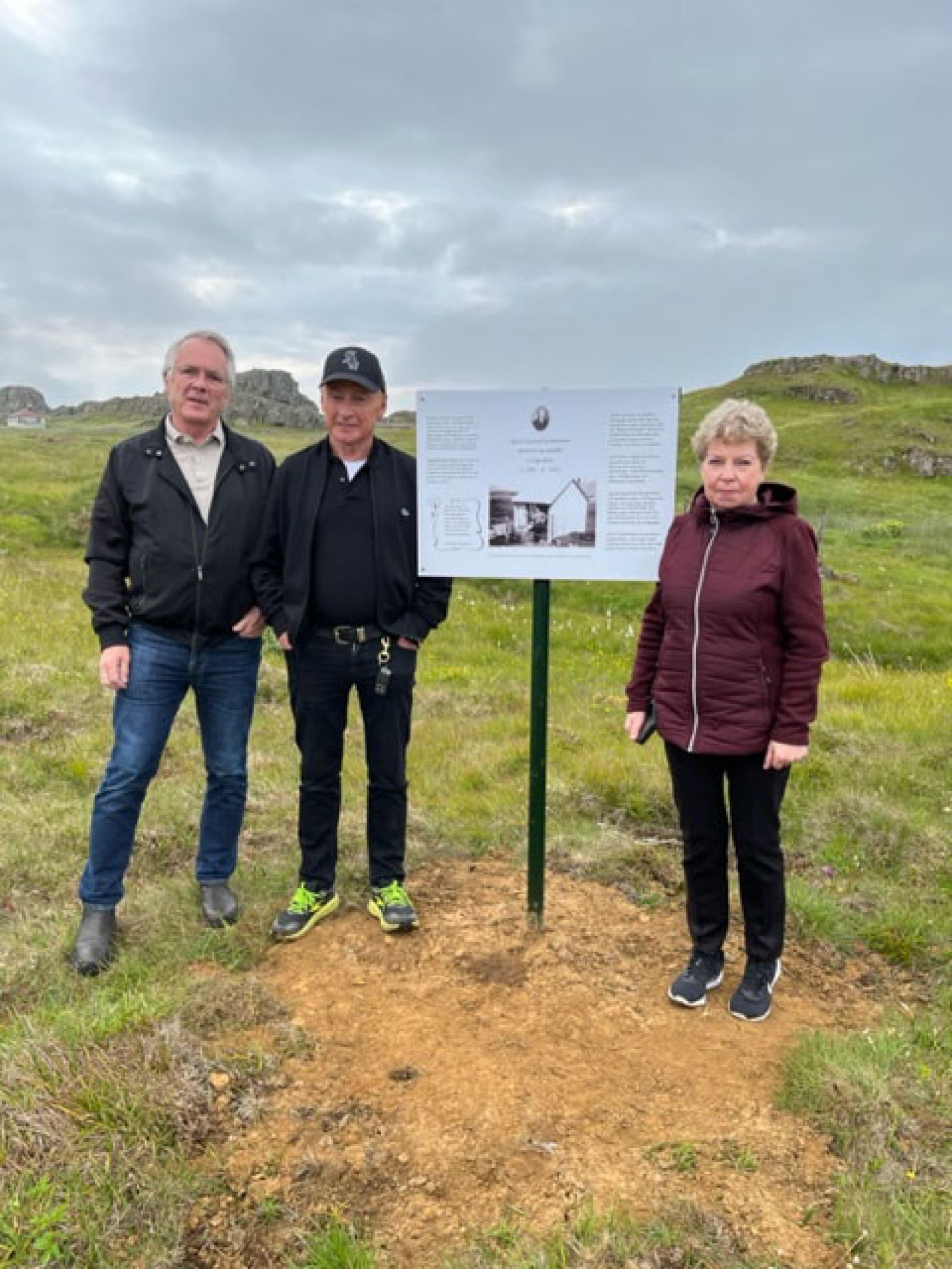 Afkomendur Jakobs, systkinin Jakob Smári Júlíusson og Halla Dröfn Júlíusdóttir með Ólafi Áka við skiltið. Mynd: Aðsend.