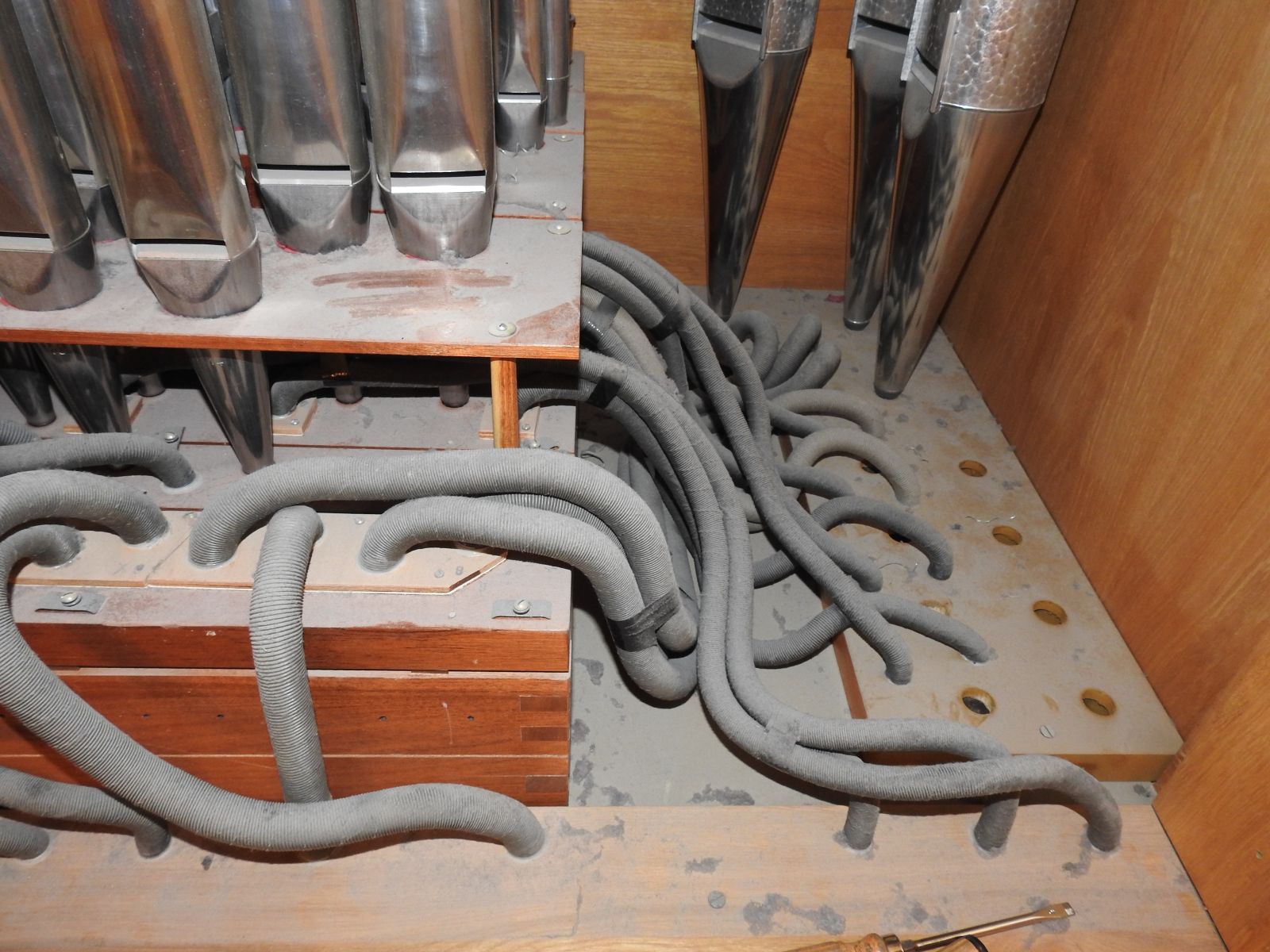 Svo er gaman að segja frá því að Hermann Eiríksson trésmiður aðstoðaði Björgvin við hljóðeinangrun á mótor og blásara svo og við lagningu lagna upp í orgelið til að taka inn loft í það ofar en áður. En Hermann hefur sungið í Kór Egilsstaðakirkju frá því að kirkjan var vígð og var einmitt meðal lykilmanna í orgelkaupunum á sínum tíma.“