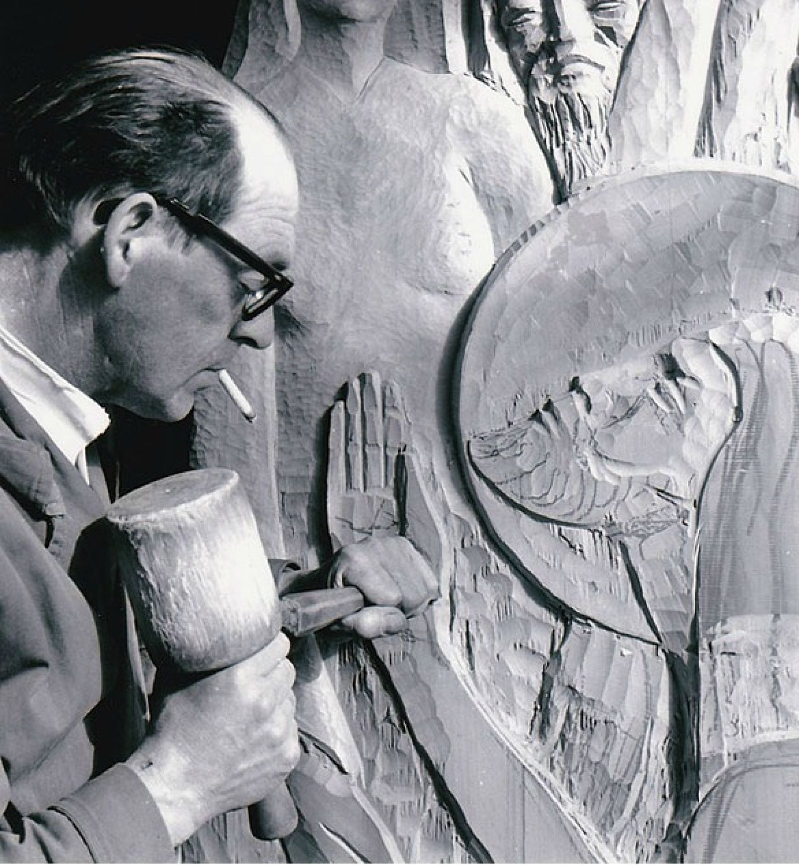 Við erum hrifin af menningarmiðstöðinni á Eskifirði og völdum að vera þar, þó svo að þar sé ekki skírnarfontur eftir hann. Sýningin er ekki stór en á henni er ein stór mynd af landvætti Austurlands, drekanum, ásamt nokkrum minni ljósmyndum af verkum hans og upplýsingum um hann sjálfan.