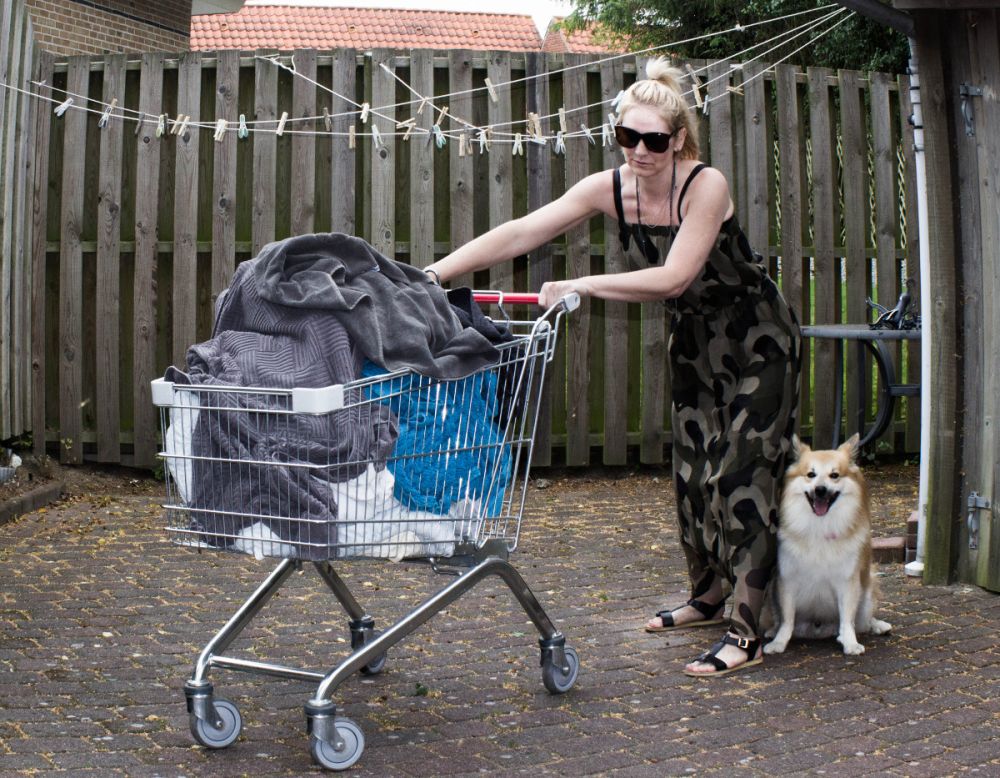 Síðan er auðvelt að ýta þvottakerrunni út að snúrum eftir flísalögðum bakgarðinum, hengja upp þvottinn og á meðan þvotturinn þornar bíður þvottakerran hrein og fín, því að hún heldur hvorki vatni né laufblöðum.